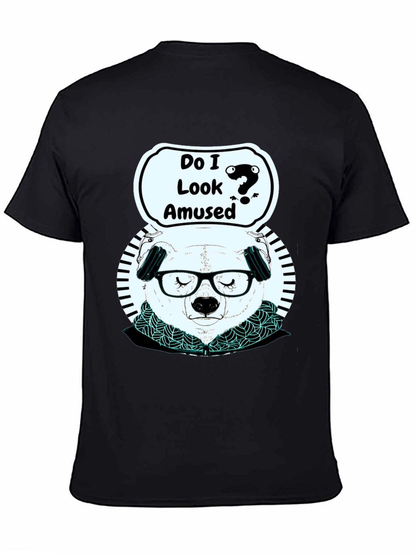 This black t-shirt features a unique and humorous design. A hipster panda bear with glasses and headphones is the central image, surrounded by a stylish patterned scarf. Above the panda is a speech bubble that says "Do I Look Amused?" with a playful question mark. The design is set against a circular striped background. This tee is perfect for those who enjoy quirky, statement pieces, and a comfortable, casual look. Whether you're lounging at home or going out with friends, this t-shirt is sure to spark a conversation. It's a fun, eye-catching way to express your personality and sense of humor.