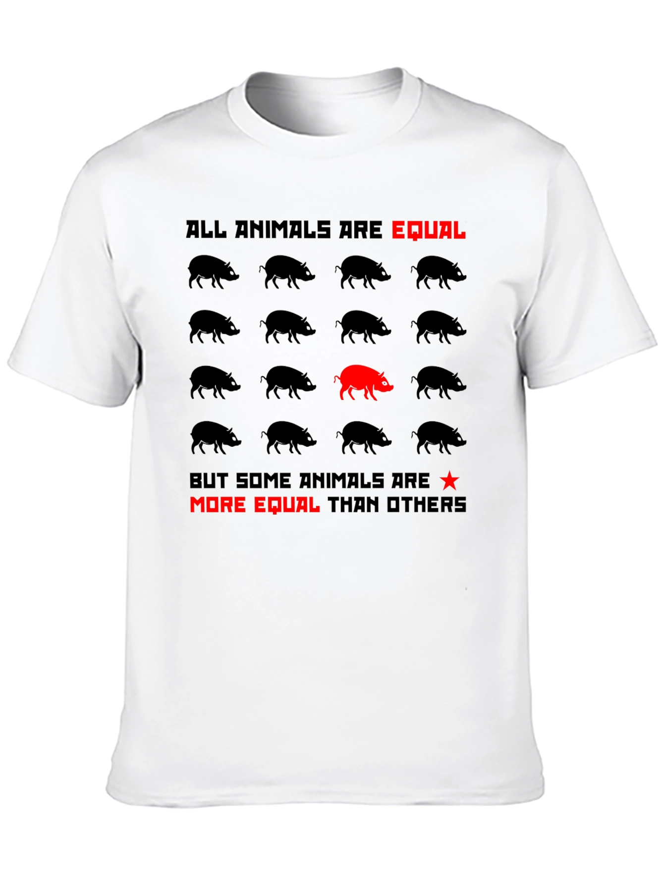 Show off your literary side with this unique black t-shirt featuring a graphic inspired by George Orwell's Animal Farm. The shirt boldly states, "ALL ANIMALS ARE EQUAL, BUT SOME ANIMALS ARE MORE EQUAL THAN OTHERS" in a striking red font. The design includes a grid of silhouetted pigs, with one pig highlighted in red. Made from comfortable materials, this tee is perfect for casual wear, book clubs, or making a statement. Get yours today!