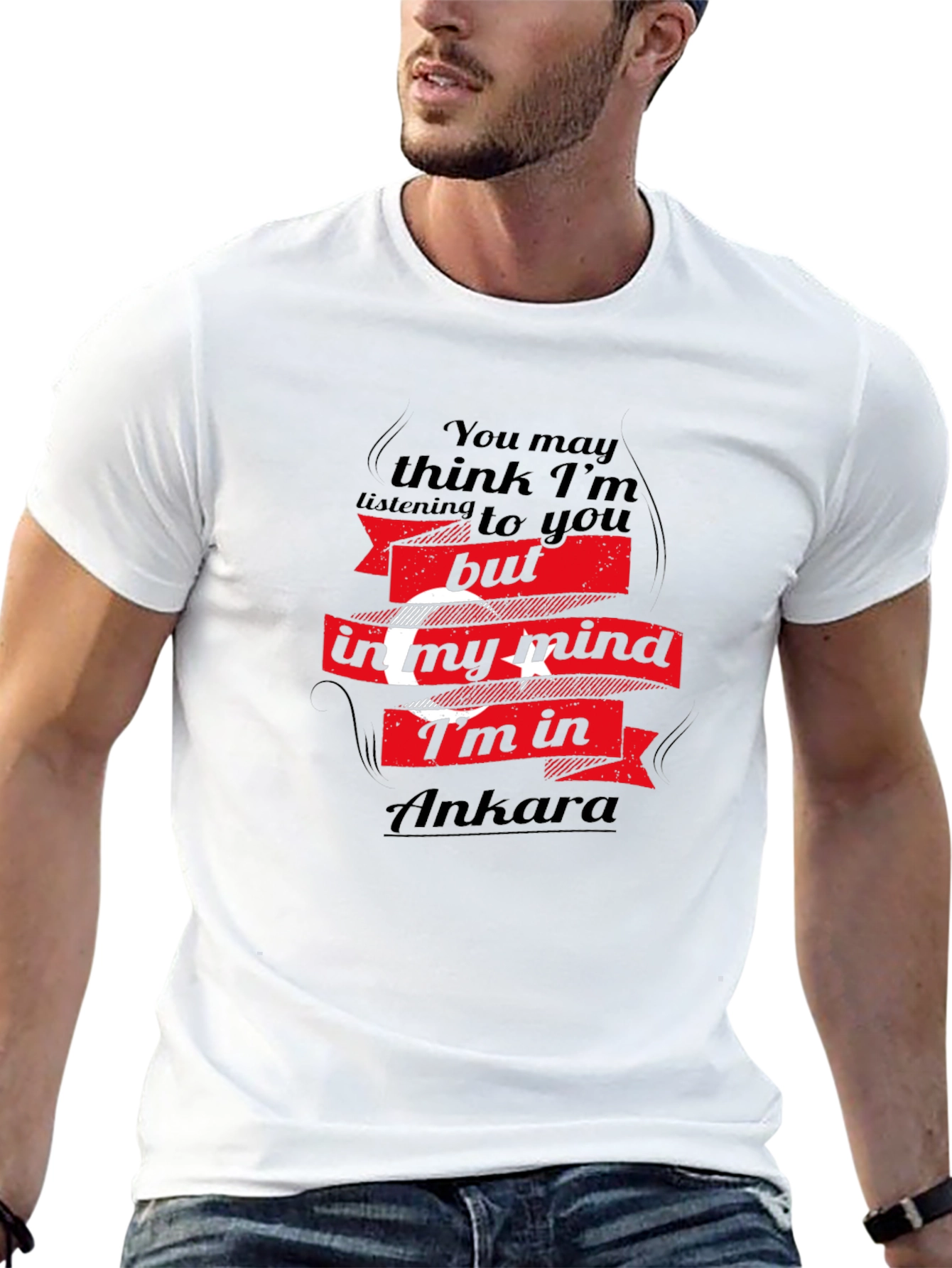 This black t-shirt features a unique graphic design perfect for those who daydream about Ankara. The playful text reads "You may think I'm listening to you but in my mind I'm in Ankara," incorporating elements reminiscent of the Turkish flag in its design. Made from a soft and comfortable fabric, this tee is ideal for casual wear, travel, or as a fun conversation starter. Show off your love for Ankara or gift it to a fellow traveler! This shirt is sure to bring a smile and spark interesting discussions wherever you go. A comfortable and stylish way to express your wanderlust!