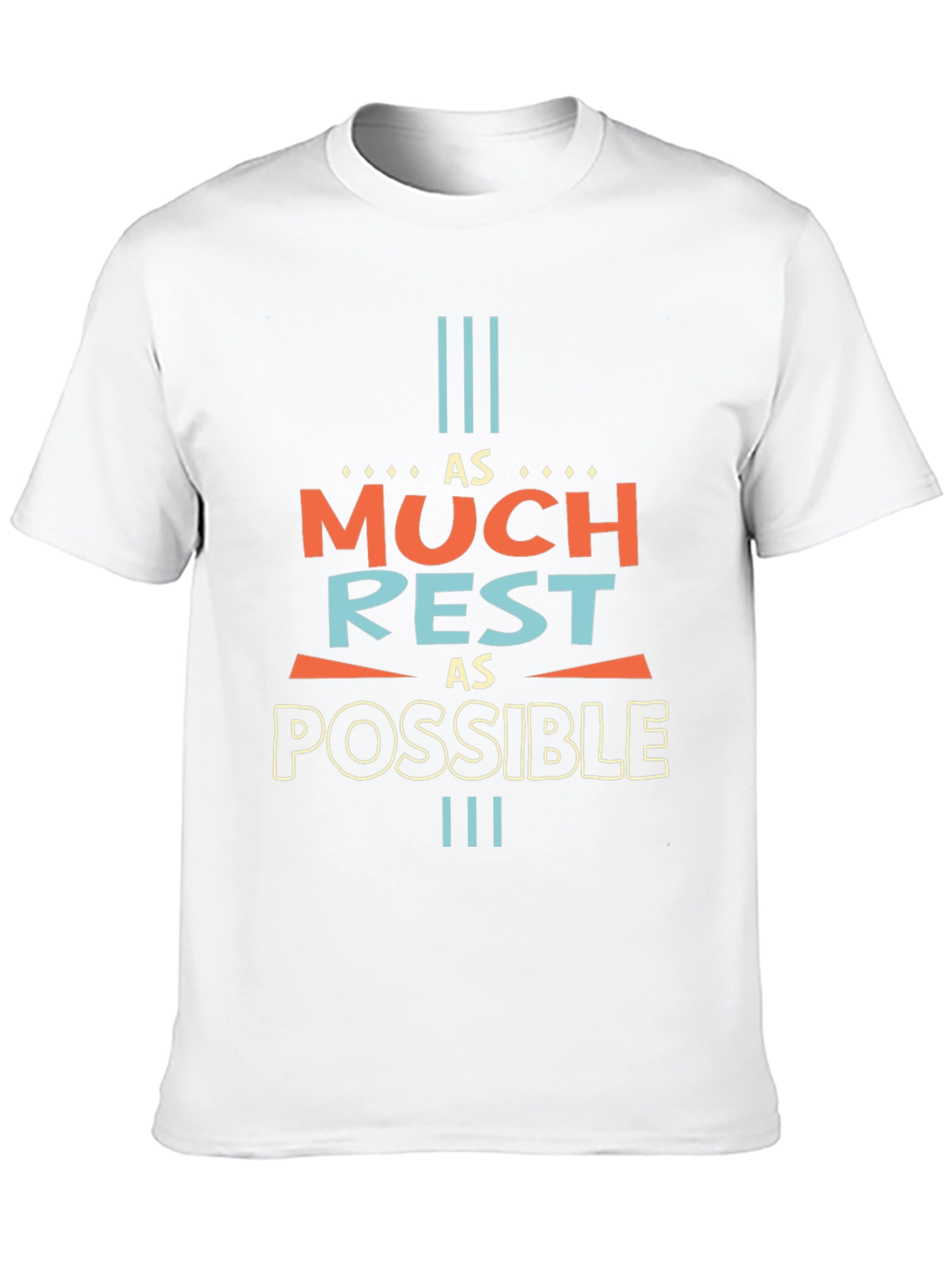 Embrace comfort and style with this unique graphic t-shirt. The design features the phrase "As Much Rest As Possible" in a mix of vibrant colors – orange, blue, and yellow – adding a playful touch. The tee is made from a soft, breathable fabric, ensuring all-day comfort. Perfect for casual outings, lounging at home, or making a statement, this tee combines a relaxed fit with an eye-catching design. Stand out from the crowd with this stylish and comfortable graphic tee that speaks to the importance of relaxation and self-care.