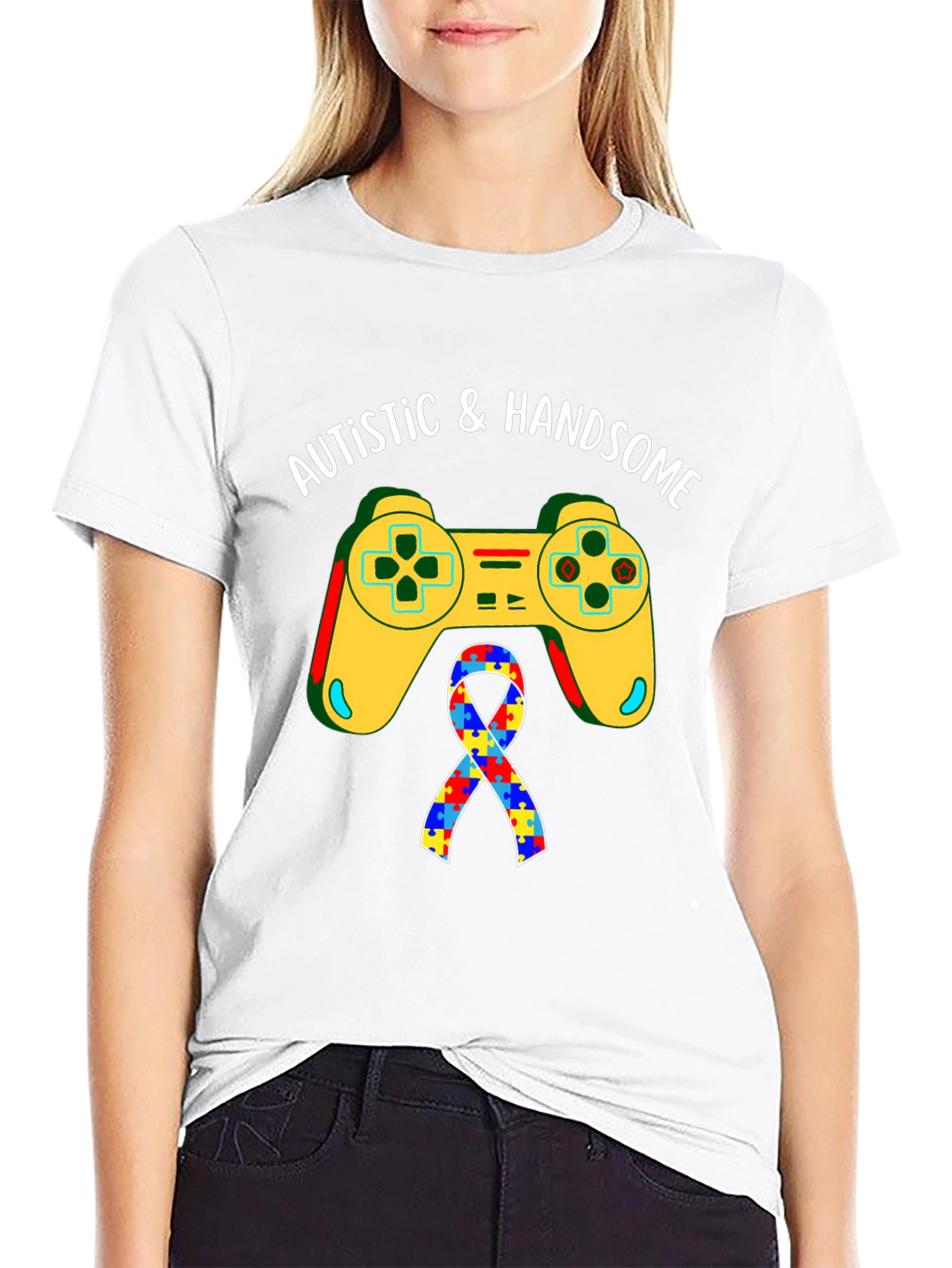 Show your support and style with this unique black t-shirt. Featuring a vibrant design with the phrase 'Autistic & Handsome' above a playful gaming controller and an Autism awareness ribbon. Perfect for gamers and advocates alike, this shirt combines comfort with a meaningful message. It's an ideal conversation starter and a great way to express yourself while supporting a cause. Wear it casually, at gaming events, or during Autism awareness campaigns. Made with quality materials for lasting comfort and durability.