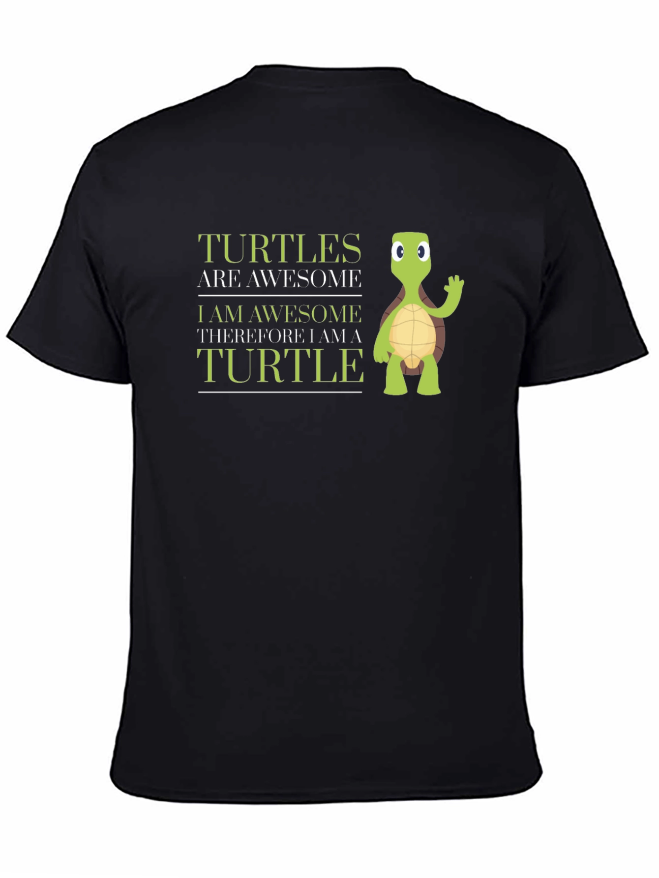 Showcase your love for turtles with this unique t-shirt! This black t-shirt features a fun design with the words "TURTLES ARE AWESOME, I AM AWESOME THEREFORE I AM A TURTLE" alongside a friendly cartoon turtle waving hello. The shirt appears to be made of a comfortable fabric, perfect for everyday wear. It's a great conversation starter and a must-have for any turtle enthusiast. Wear it casually or dress it up, this t-shirt is sure to make a statement. Get yours today and let everyone know you're part of the awesome turtle team!