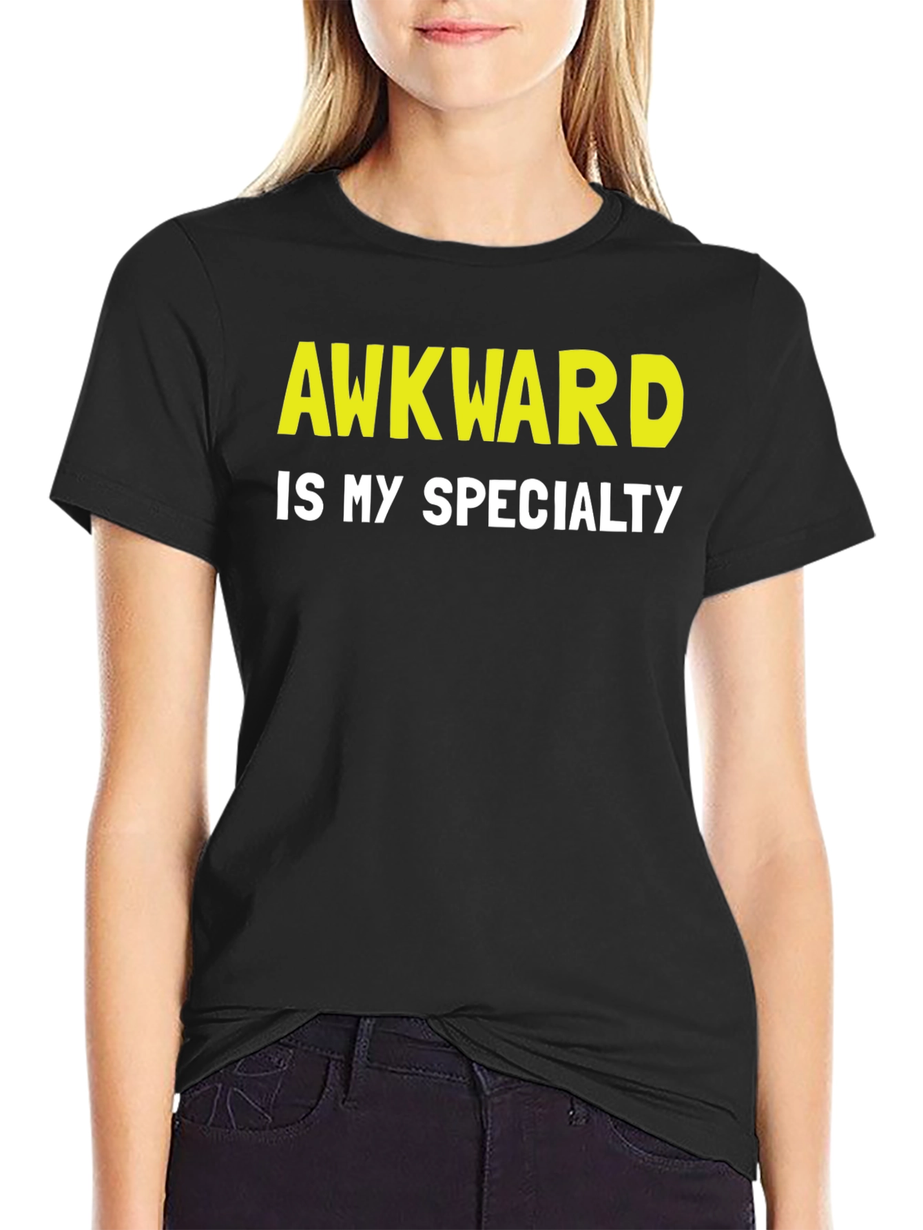 Embrace your inner awkwardness with this fun and relatable t-shirt. The design features the phrase "Awkward is My Specialty" in bold, contrasting yellow and white text on a classic black tee. Made from a soft and comfortable fabric, this shirt is perfect for everyday wear. Show off your unique personality and sense of humor with this eye-catching t-shirt. Whether you're lounging at home, running errands, or hanging out with friends, this shirt is sure to spark conversations and bring a smile to those around you. A perfect way to embrace your quirks and celebrate being yourself!