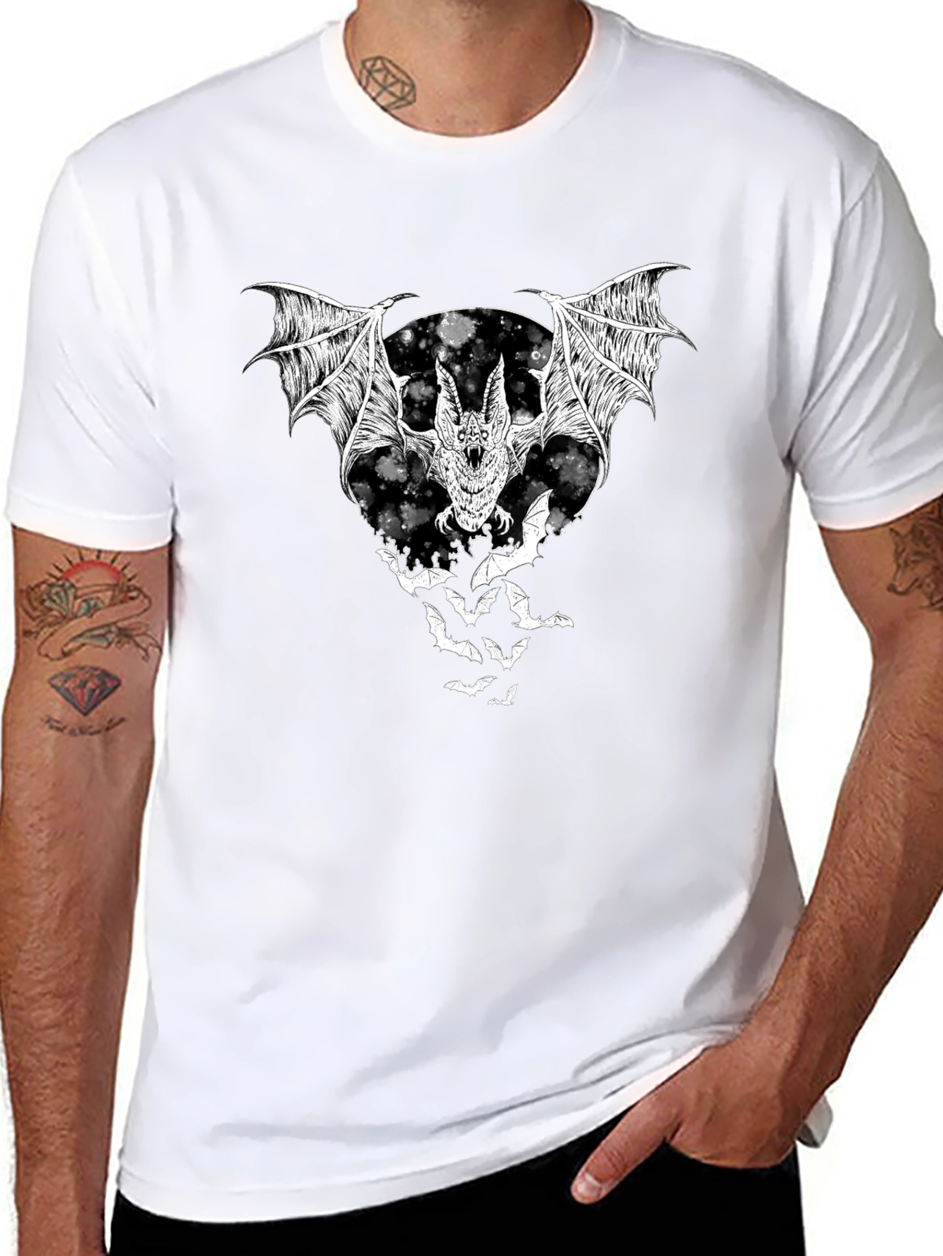 Embrace the night with this striking black t-shirt, featuring a bold graphic of a bat with intricately detailed wings, set against a starlit moon background. This tee is crafted from a comfortable, soft fabric that drapes well. The design includes a flock of smaller bats descending from the central image, adding depth and a touch of the mysterious. Perfect for Halloween, goth aesthetics, or anyone who appreciates unique graphic tees, this shirt is a versatile addition to your wardrobe. Pair it with jeans or layer it under a jacket for a distinctive look. Make a statement with this eye-catching and comfortable t-shirt.