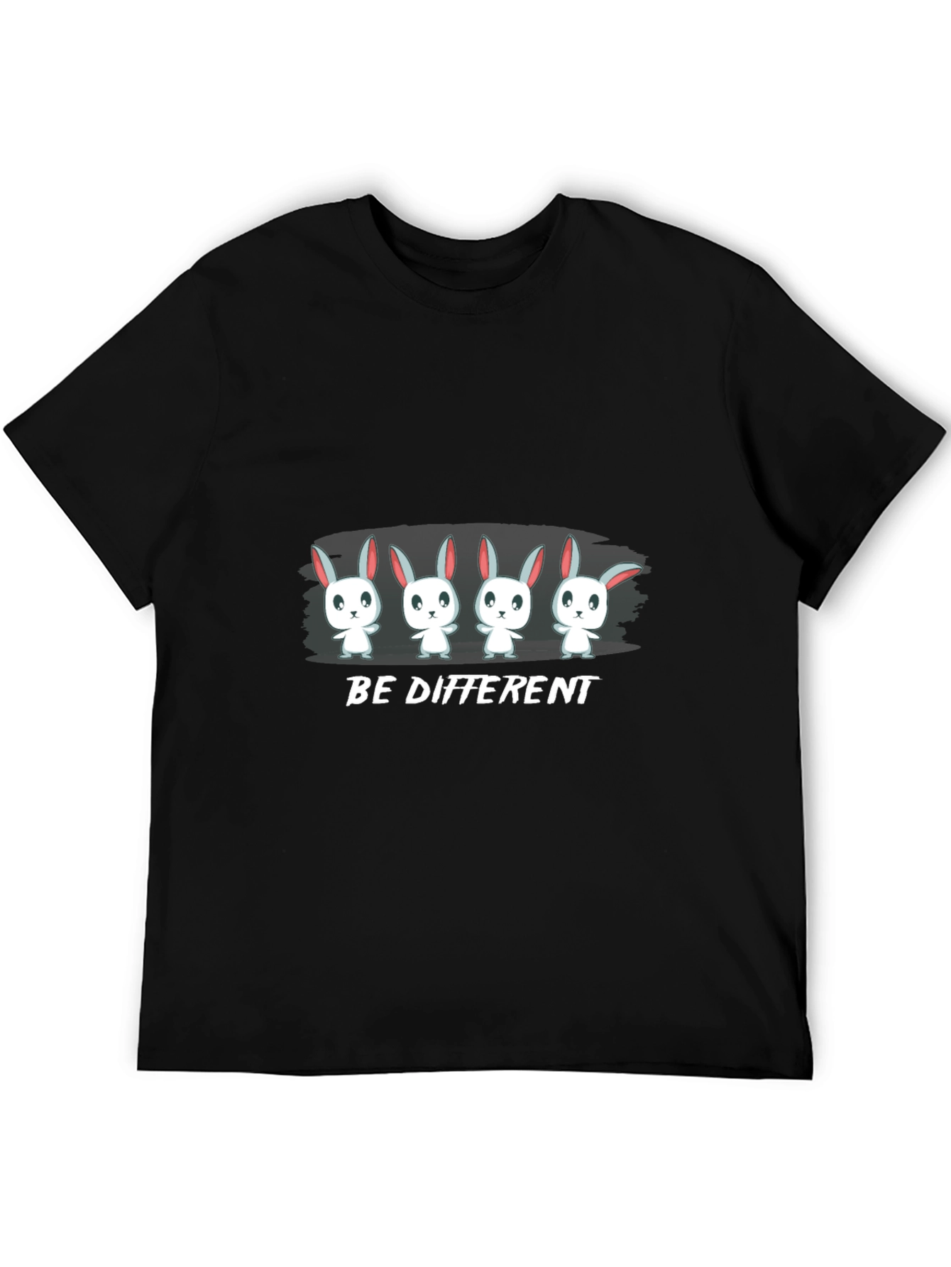 Stand out from the crowd in this unique black t-shirt featuring an adorable "Be Different" bunny graphic. This tee showcases four charming bunnies, one with a uniquely colored ear, promoting individuality. Made from a comfortable and durable fabric, this tee is perfect for casual wear. Show off your playful side and make a statement with this trendy design. Great for everyday wear, social events, or as a thoughtful gift for the bunny lover in your life. Let this shirt be a reminder to embrace your uniqueness!