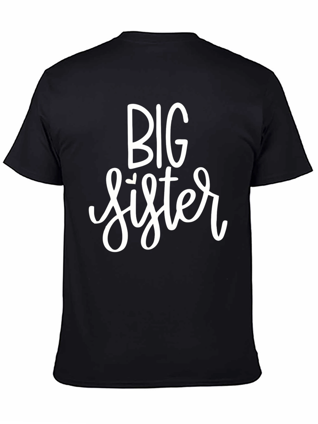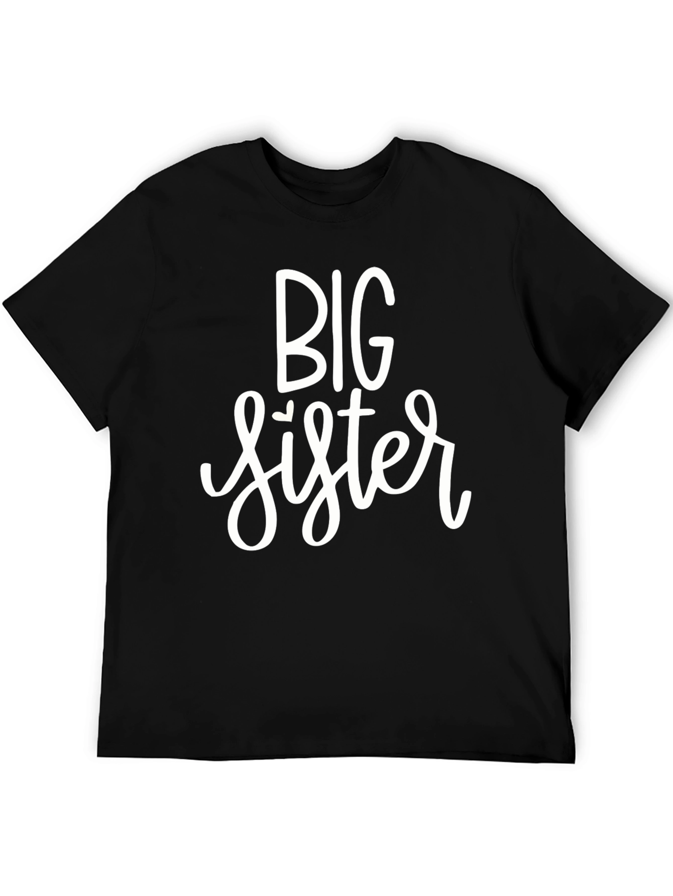 Announce the arrival of a new sibling with this adorable black t-shirt! The shirt features the words "Big Sister" in a playful, flowing white font. Made from what appears to be a soft and comfortable cotton blend, this tee is perfect for everyday wear. Let your child show off their excitement and love for their new role with this charming shirt. It's an ideal gift for expecting families, baby showers, or simply to celebrate the growing family. Capture adorable photos and create lasting memories with this special "Big Sister" tee!