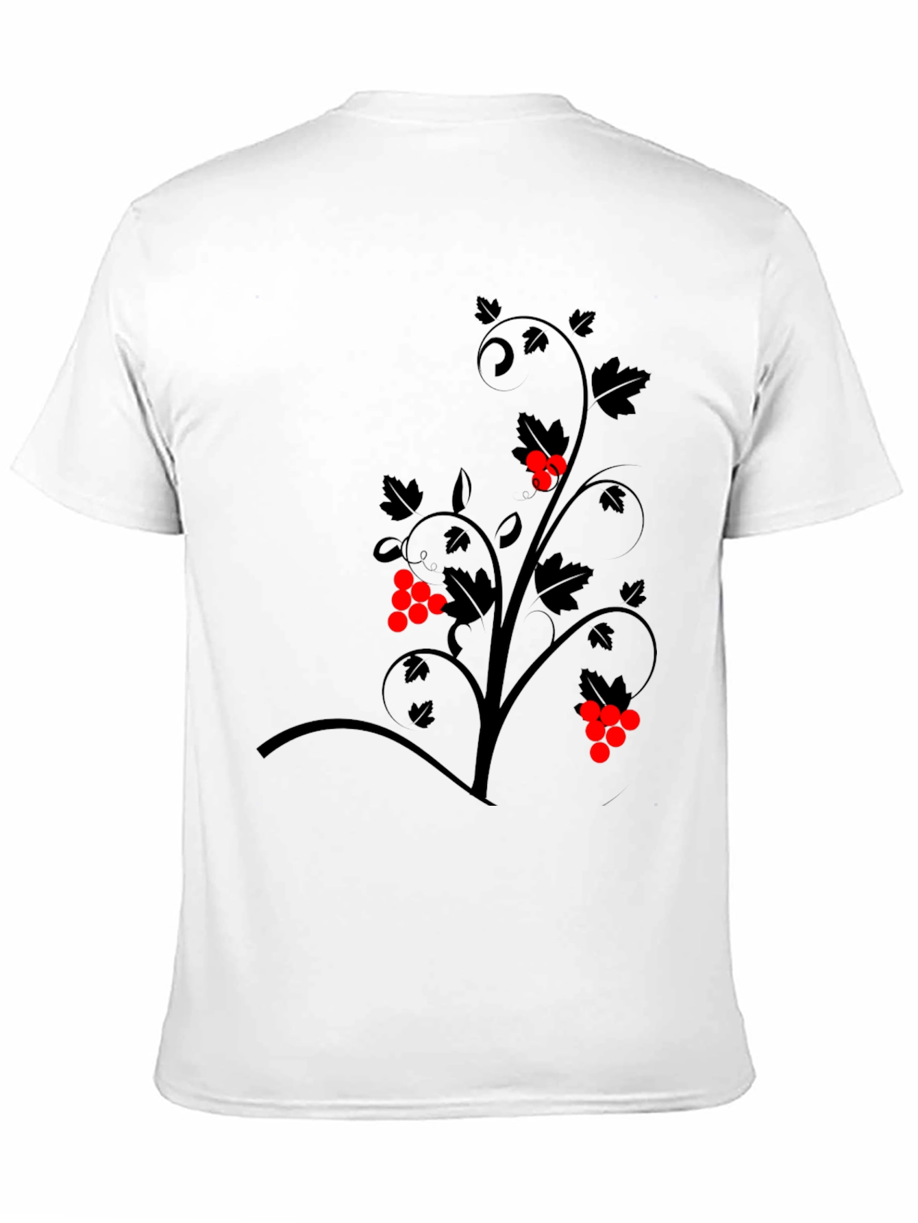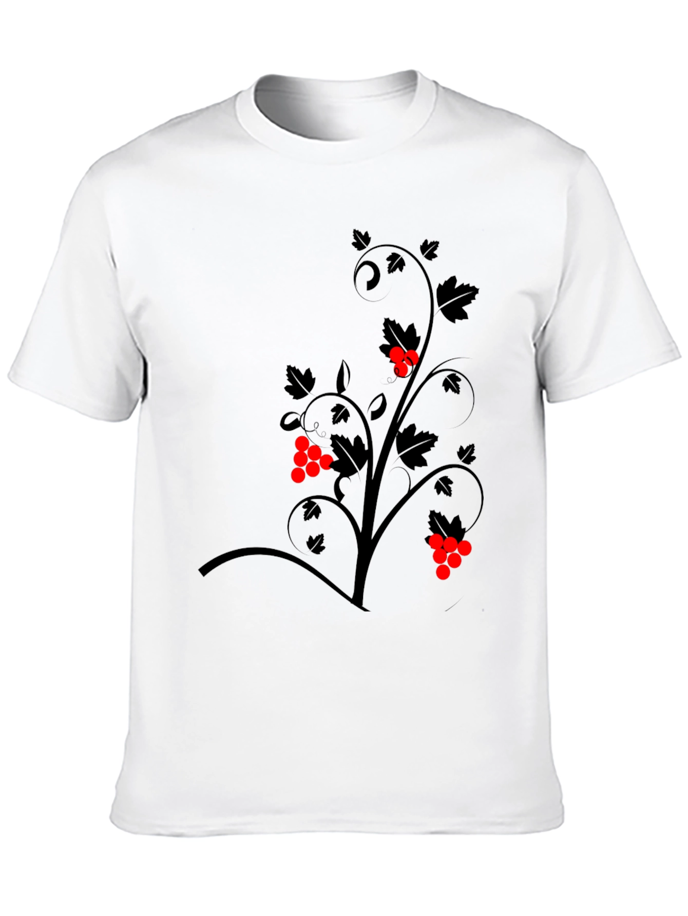 Elevate your casual style with this eye-catching black t-shirt. The shirt features a unique vine design, artistically rendered in black with vibrant red berry accents. The intricate floral pattern adds a touch of sophistication, making it a versatile piece for any wardrobe. Constructed from a soft, comfortable fabric, this tee is perfect for everyday wear. The classic crew neck and short sleeves offer a relaxed fit, while the striking graphic print ensures you'll stand out from the crowd. Pair it with jeans for a casual look or dress it up with chinos for a more polished ensemble. A must-have for anyone who appreciates stylish and comfortable apparel.