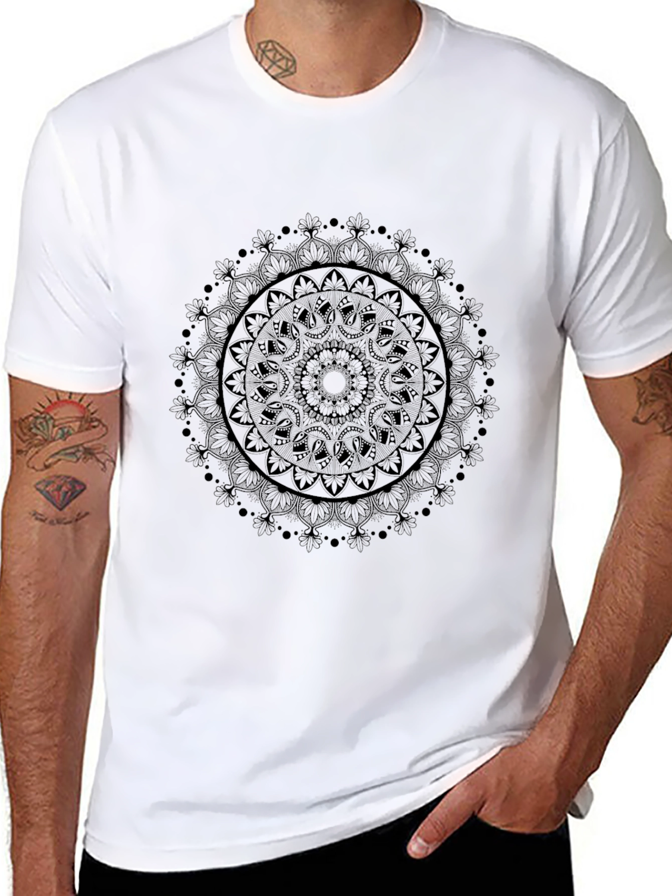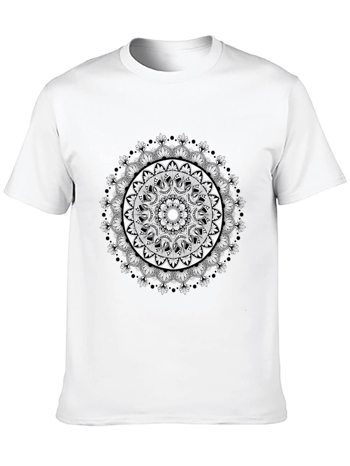 Embrace minimalist style with this black crew neck t-shirt. Crafted from a soft, comfortable fabric, this tee features a subtle yet intricate mandala design at its center, adding a touch of understated elegance. The short sleeves and classic fit make it perfect for everyday wear, while the unique print elevates it beyond a basic tee. Dress it up with dark wash jeans and boots for a night out, or keep it casual with shorts and sneakers for a relaxed weekend vibe. A versatile piece that complements any wardrobe.