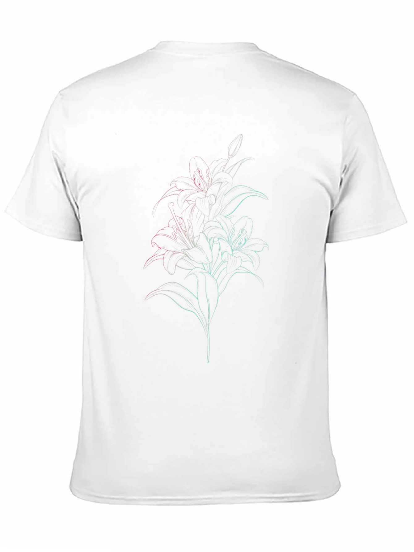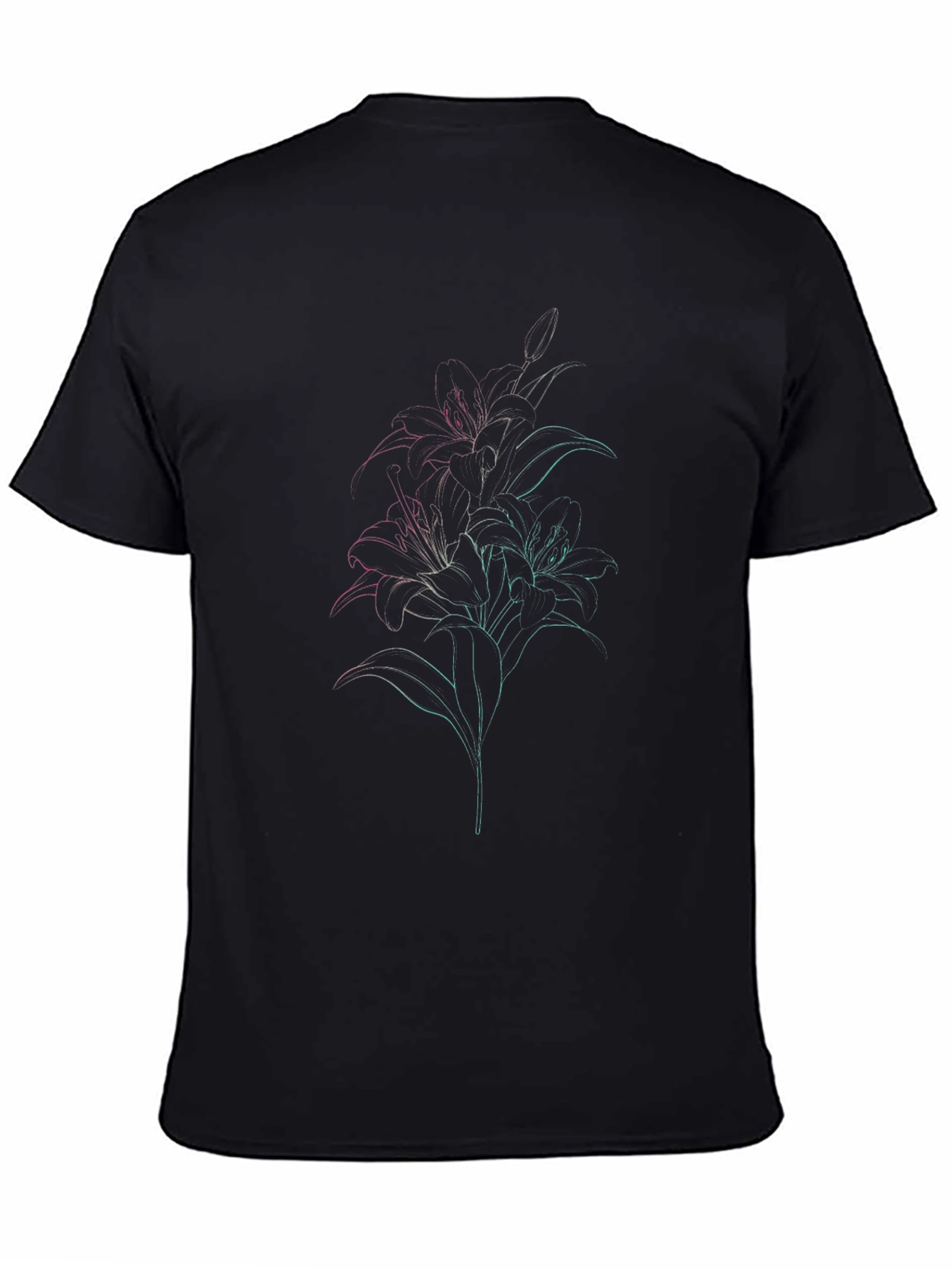 This classic black t-shirt features a unique and eye-catching floral design. The design is a beautiful outline of lilies, creating a modern and minimalist aesthetic. Crafted from soft, breathable fabric, this t-shirt offers both comfort and style. The clean design makes it versatile, perfect for casual outings, layering under jackets, or simply lounging at home. The floral outline adds a touch of elegance and sophistication, making it a great conversation starter. Pair it with jeans for a relaxed look or dress it up with chinos for a more polished ensemble. A stylish and comfortable addition to any wardrobe.