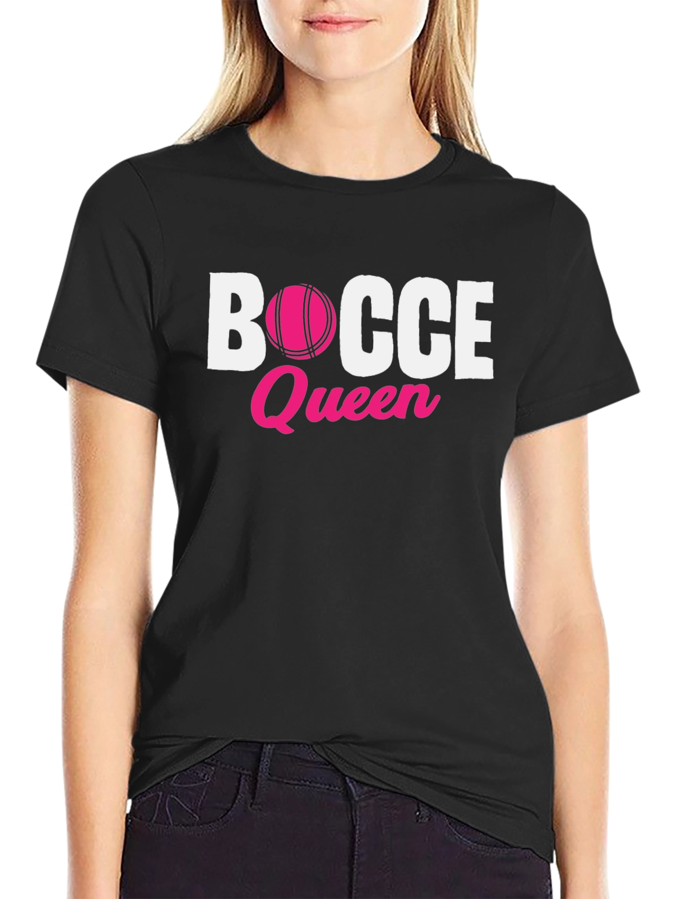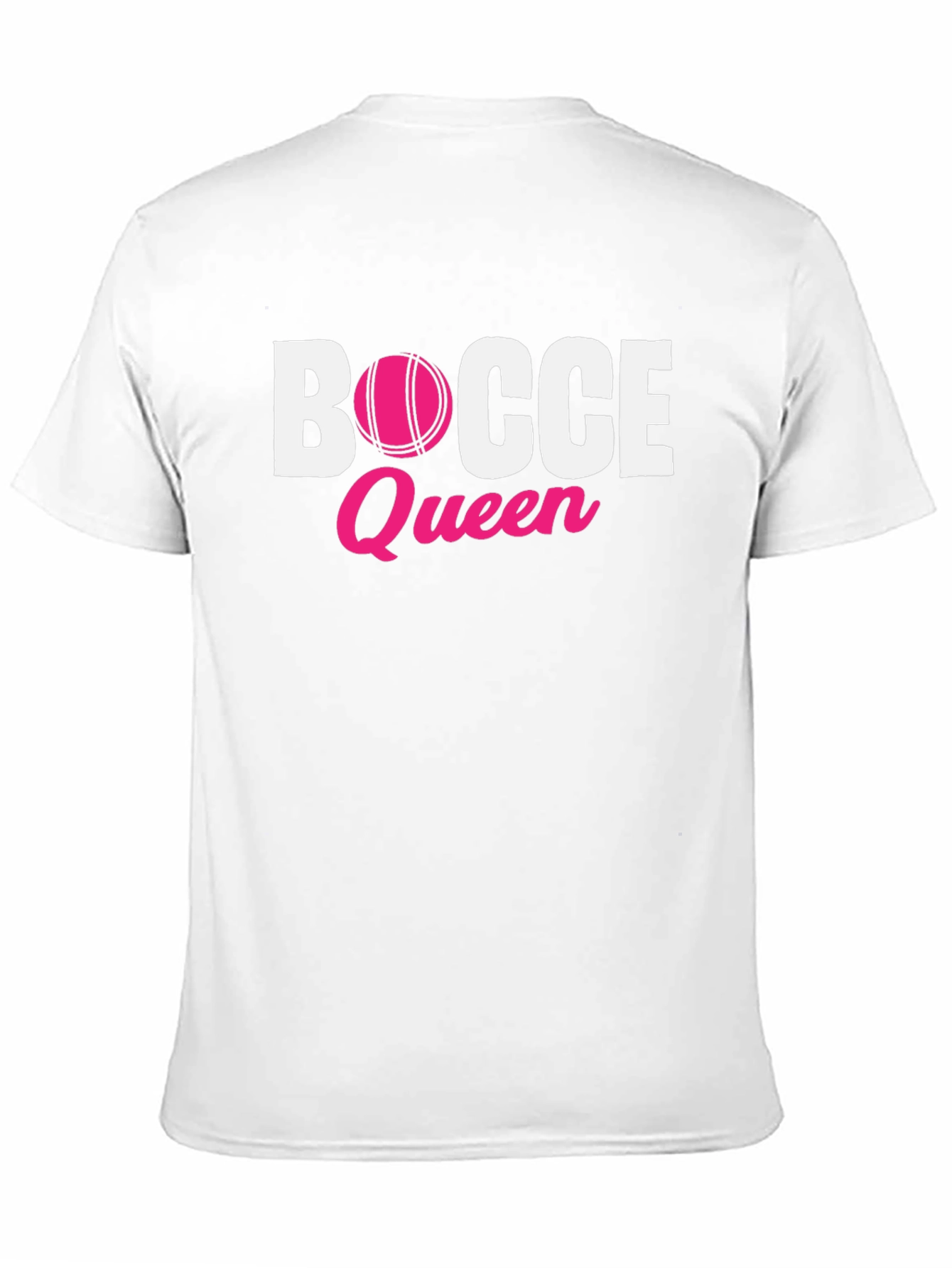 Show off your love for bocce ball with this stylish and comfortable t-shirt! This black tee features a bold "Bocce" graphic in white, with the "O" replaced by a pink bocce ball. Below that, the word "Queen" is displayed in a matching pink script font, adding a touch of fun. Made from soft and breathable fabric, this shirt is perfect for casual wear, bocce ball tournaments, or lounging around. The classic fit is flattering for all body types, making it a great gift for the bocce enthusiast in your life. Stand out from the crowd with this unique and eye-catching design.