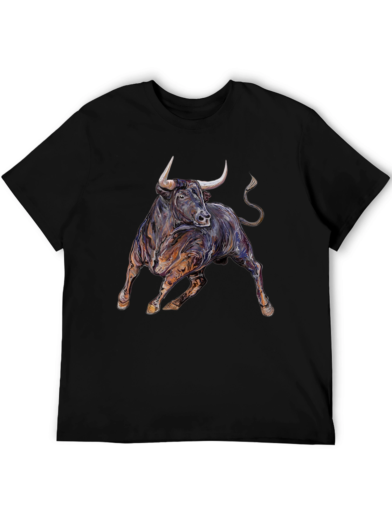 Unleash your inner strength with this striking black graphic tee. Featuring a dynamic bull illustration, this shirt embodies power and confidence. The intricate design showcases the bull in mid-stride, with detailed coloring and shading that bring the image to life. Made from comfortable cotton, this tee offers a relaxed fit and is perfect for everyday wear. Pair it with jeans for a casual look or dress it up with a blazer for a night out. Show off your bold style and make a statement with this unique bull graphic tee. A must-have for animal lovers and those who appreciate artful design.