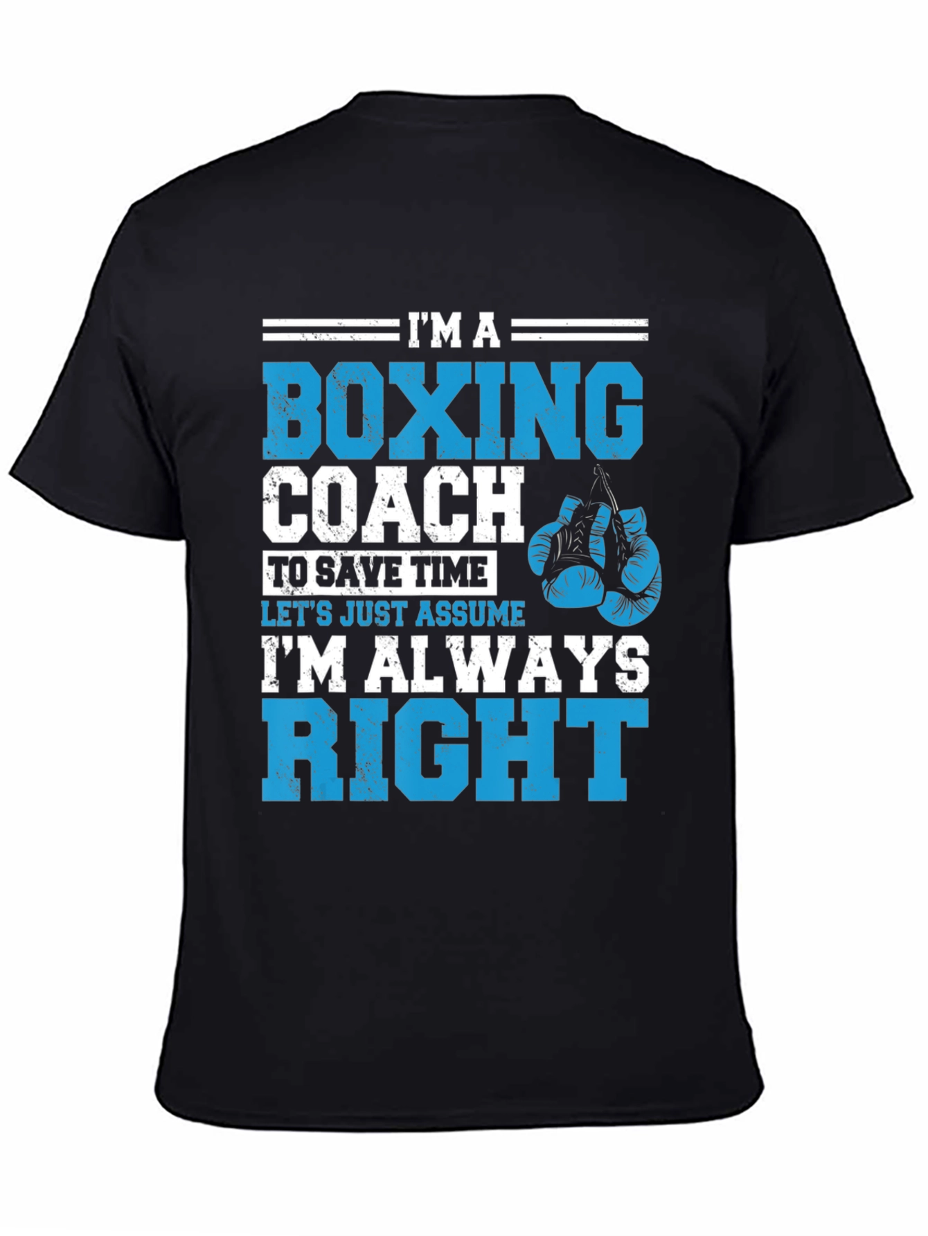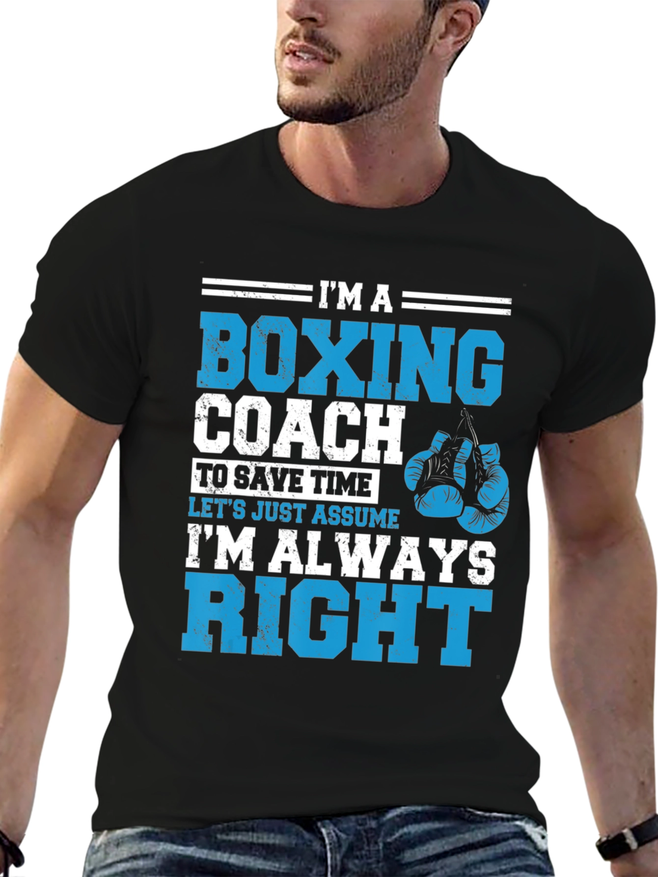 Show your love for boxing with this eye-catching black t-shirt! The design features the statement 'I'M A BOXING COACH TO SAVE TIME LET'S JUST ASSUME I'M ALWAYS RIGHT' in a bold, distressed font, with boxing glove graphic. The design suggests a sense of humor and authority. Made from what appears to be a comfortable cotton blend, this tee is ideal for coaches and boxing enthusiasts alike. Perfect for wearing to the gym, boxing matches, or casual outings, this t-shirt is sure to spark conversation and showcase your passion for the sport.
