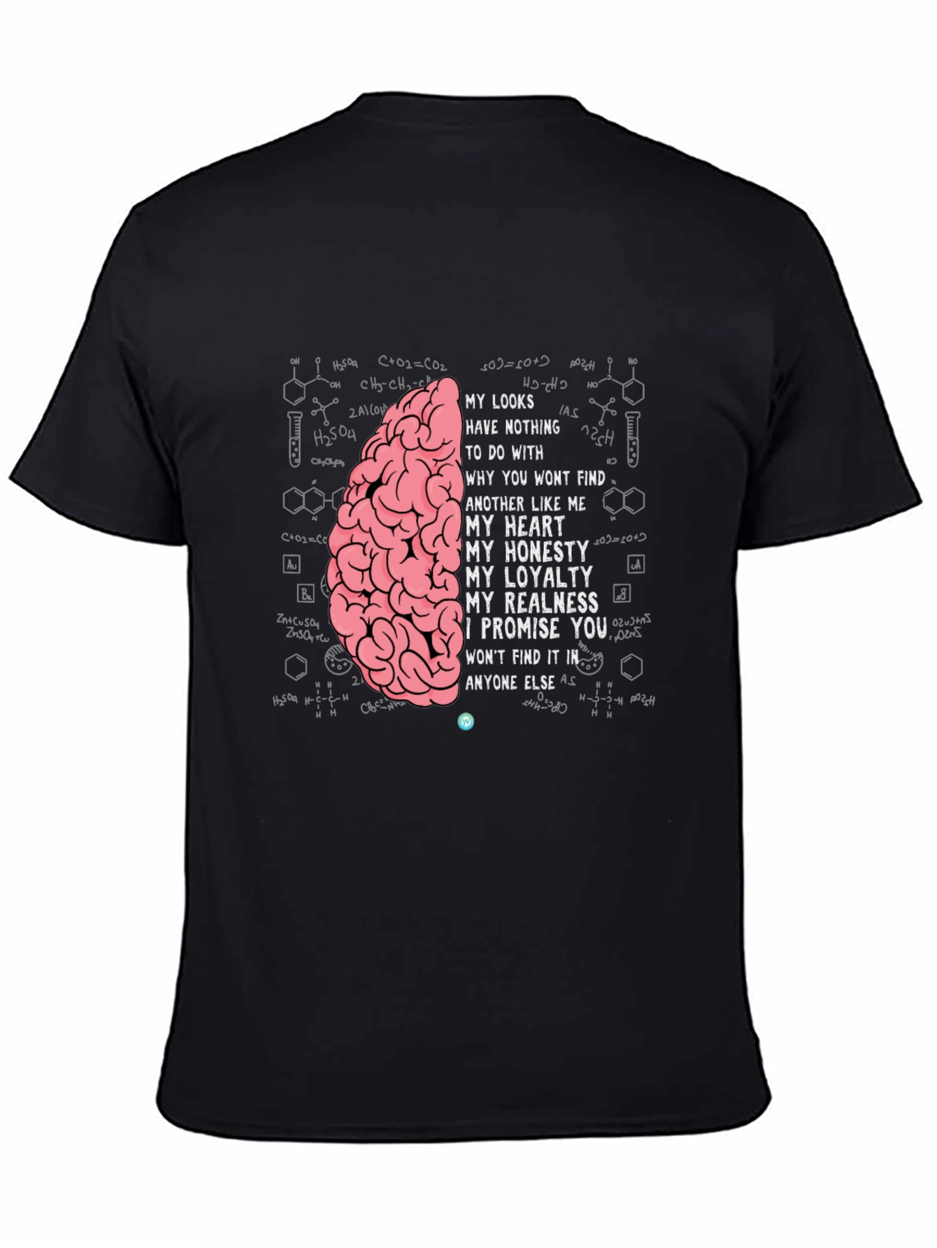 This black t-shirt features a unique design that blends intelligence and personality. One half showcases a pink anatomical brain illustration combined with various chemical formulas. The other half displays a bold declaration: "My looks have nothing to do with why you won't find another like me. My heart, my honesty, my loyalty, my realness I promise you won't find it in anyone else." Crafted from a soft-looking fabric, this tee offers both comfort and style. It's a great conversation starter and an excellent way to express your individuality, intellect, and values.