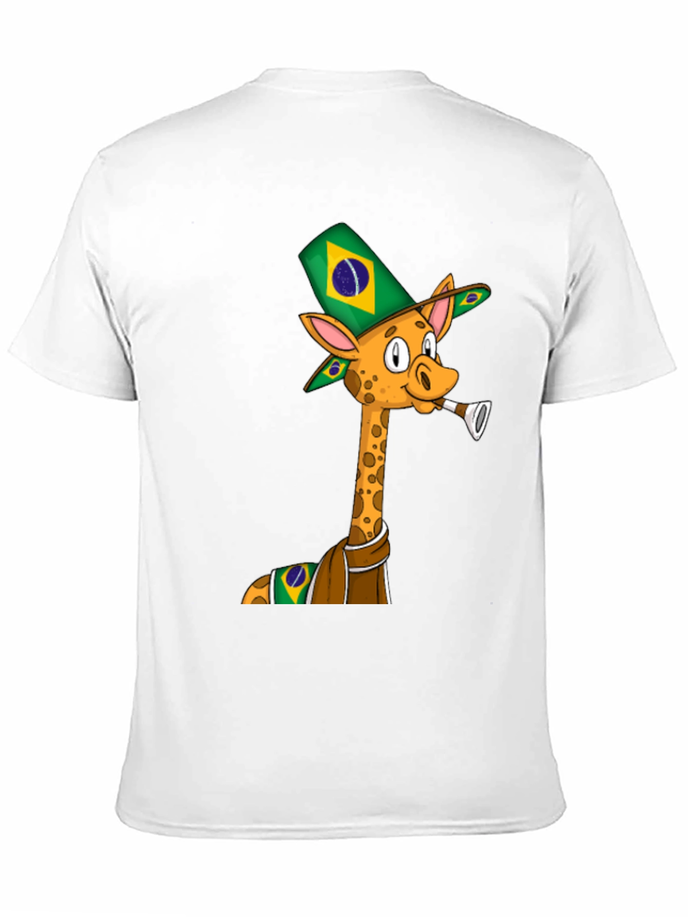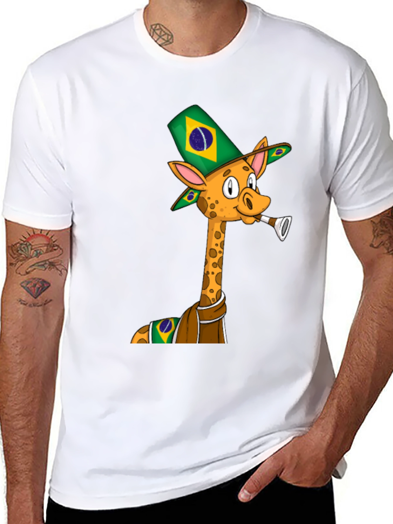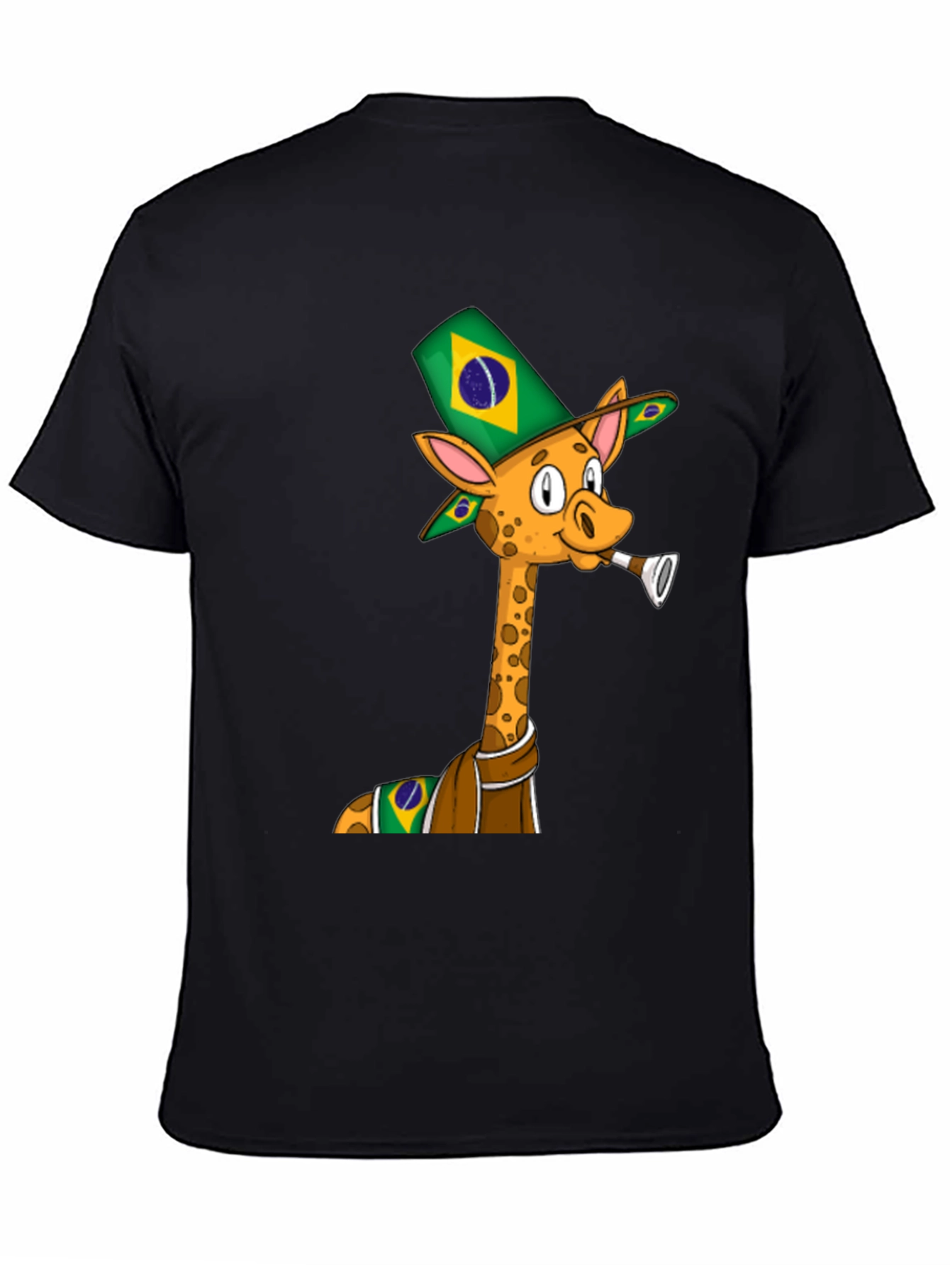 Show your love for Brazil with this unique graphic tee! This black t-shirt features a playful cartoon giraffe wearing a Brazilian flag-themed hat and sash. The detailed graphic showcases vibrant green, yellow, and blue colors, adding a fun and patriotic touch to your wardrobe. Made from soft, comfortable fabric, this tee is perfect for casual wear, sporting events, or celebrating Brazilian culture. Stand out from the crowd and express your national pride with this eye-catching t-shirt!