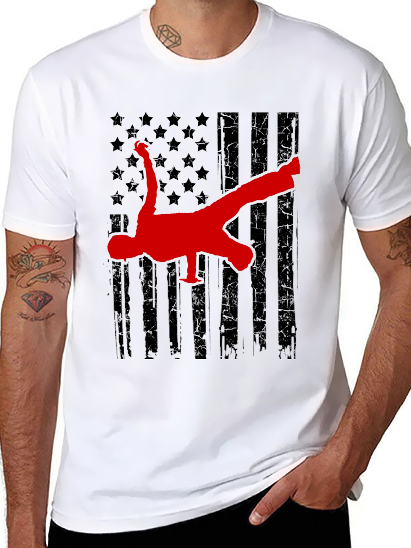 Show your love for breakdancing and American pride with this unique graphic tee! The shirt features a bold red silhouette of a breakdancer performing a dynamic move, set against a stylized black and distressed American flag backdrop. The design is eye-catching and artistic, making it a great conversation starter. The shirt itself appears to be made of a soft, comfortable black cotton blend, perfect for everyday wear or hitting the dance floor. Ideal for dancers, patriots, and anyone who appreciates cool and expressive apparel. Add a touch of street style to your wardrobe with this standout t-shirt!