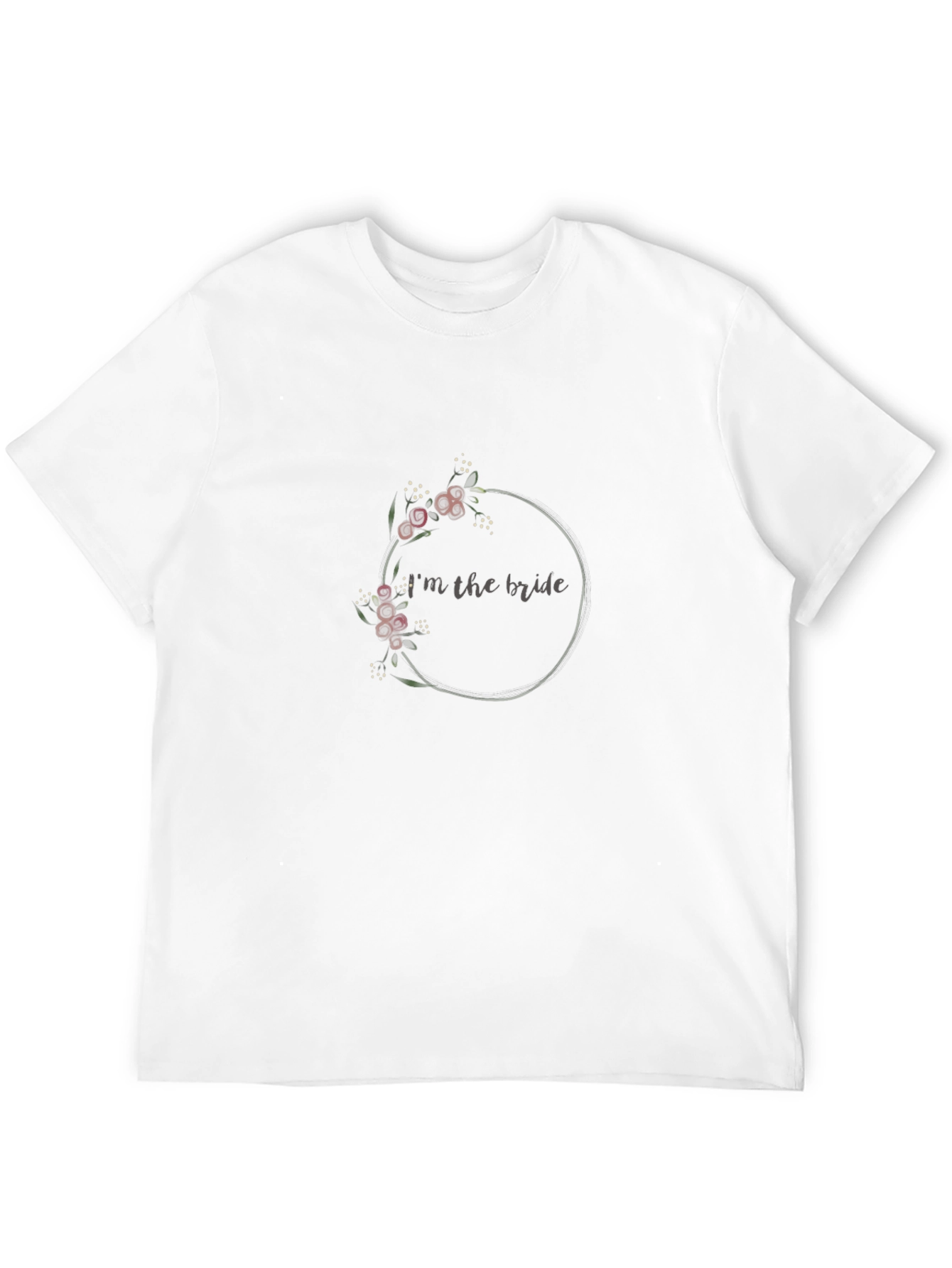 Celebrate your upcoming wedding in style with this charming "I'm the Bride" graphic t-shirt. Crafted from soft, breathable black fabric, this comfortable tee features a delicate floral wreath design surrounding the playful text. Perfect for bachelorette parties, bridal showers, or simply announcing your exciting news. The design is a circle surrounding the text, "I'm the bride" and it is composed of flowers and dots. This shirt is not only stylish but also makes a memorable keepsake. It's an ideal gift for the bride-to-be, ensuring she feels special and radiant throughout her wedding journey. Pair it with jeans for a casual chic look, or dress it up with a skirt for a touch of elegance.