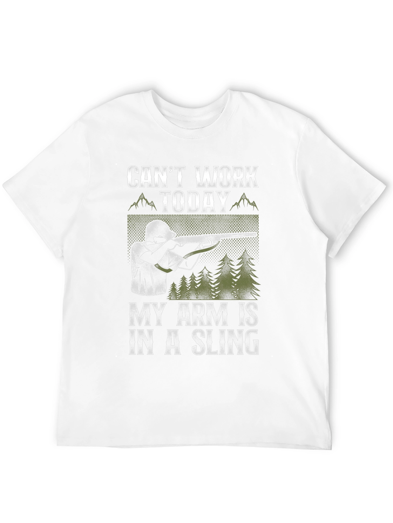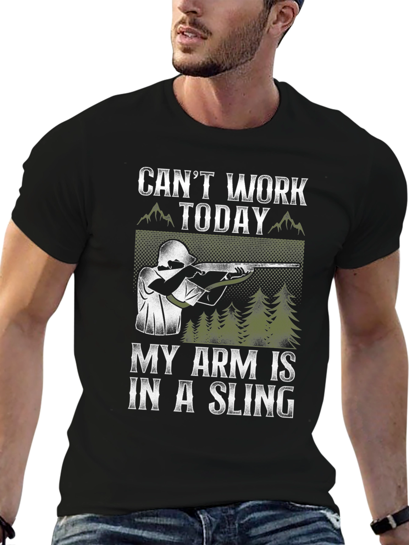 This black t-shirt features a humorous design perfect for outdoor enthusiasts. The graphic includes an image of someone with their arm in a sling, aiming a rifle, against a forest backdrop. The text reads "Can't Work Today My Arm Is In A Sling." It's made of comfortable-looking material, suitable for casual wear or hunting trips, and guaranteed to spark conversation. Ideal for those who love hunting, the outdoors, or appreciate a good joke.