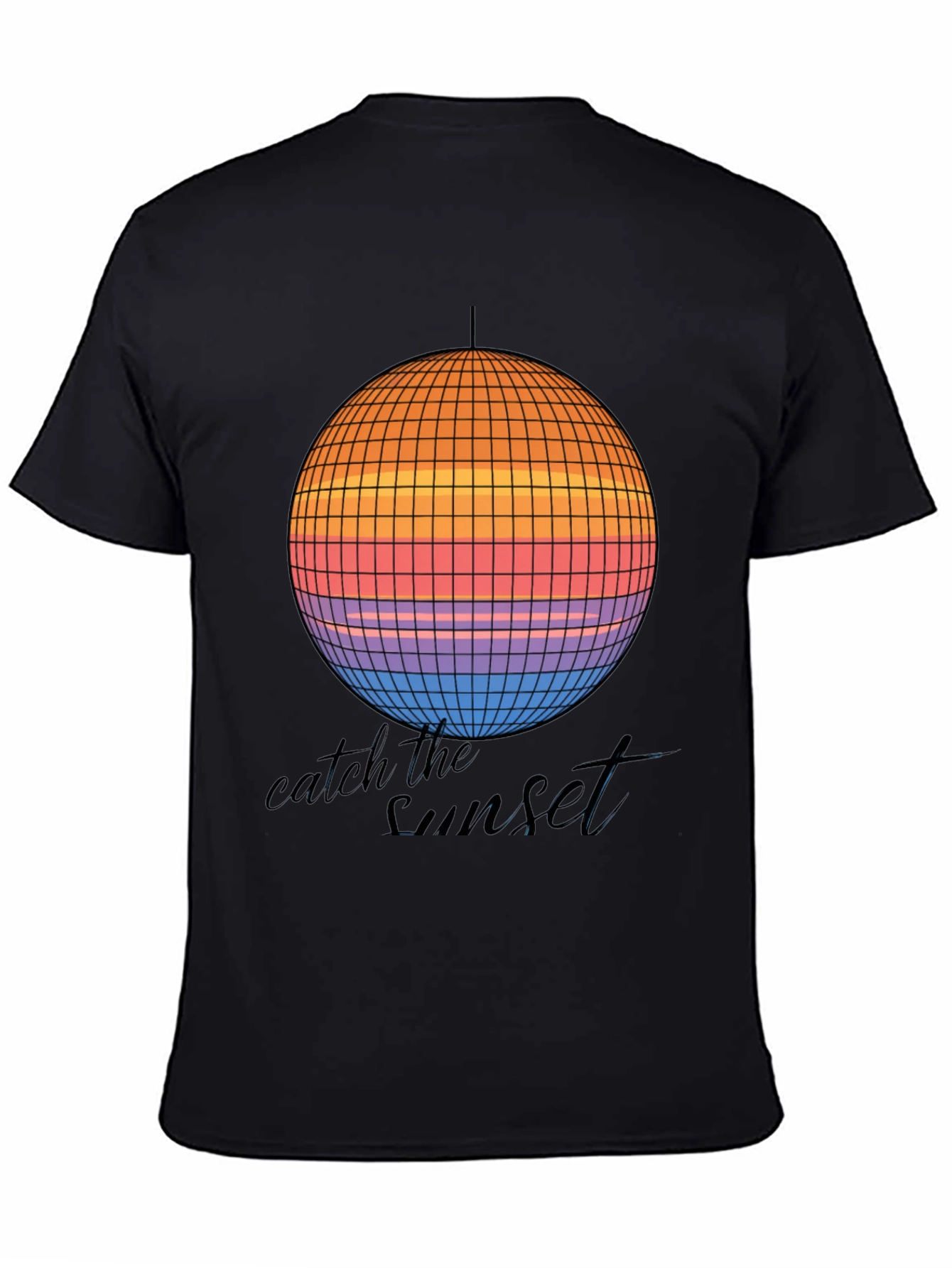 Embrace retro vibes with this eye-catching black graphic tee. The design features a disco ball rendered in vibrant sunset hues of orange, pink, purple, and blue. The grid pattern adds a geometric touch, while the "catch the sunset" script adds a touch of whimsy. Made from a comfortable, breathable fabric, this tee is perfect for casual outings, music festivals, or adding a pop of color to your everyday style. The design is bold and printed well, the shirt is soft and fits well. Wear this tee to express your love for music, sunsets, and vintage aesthetics. A must-have addition to any wardrobe!
