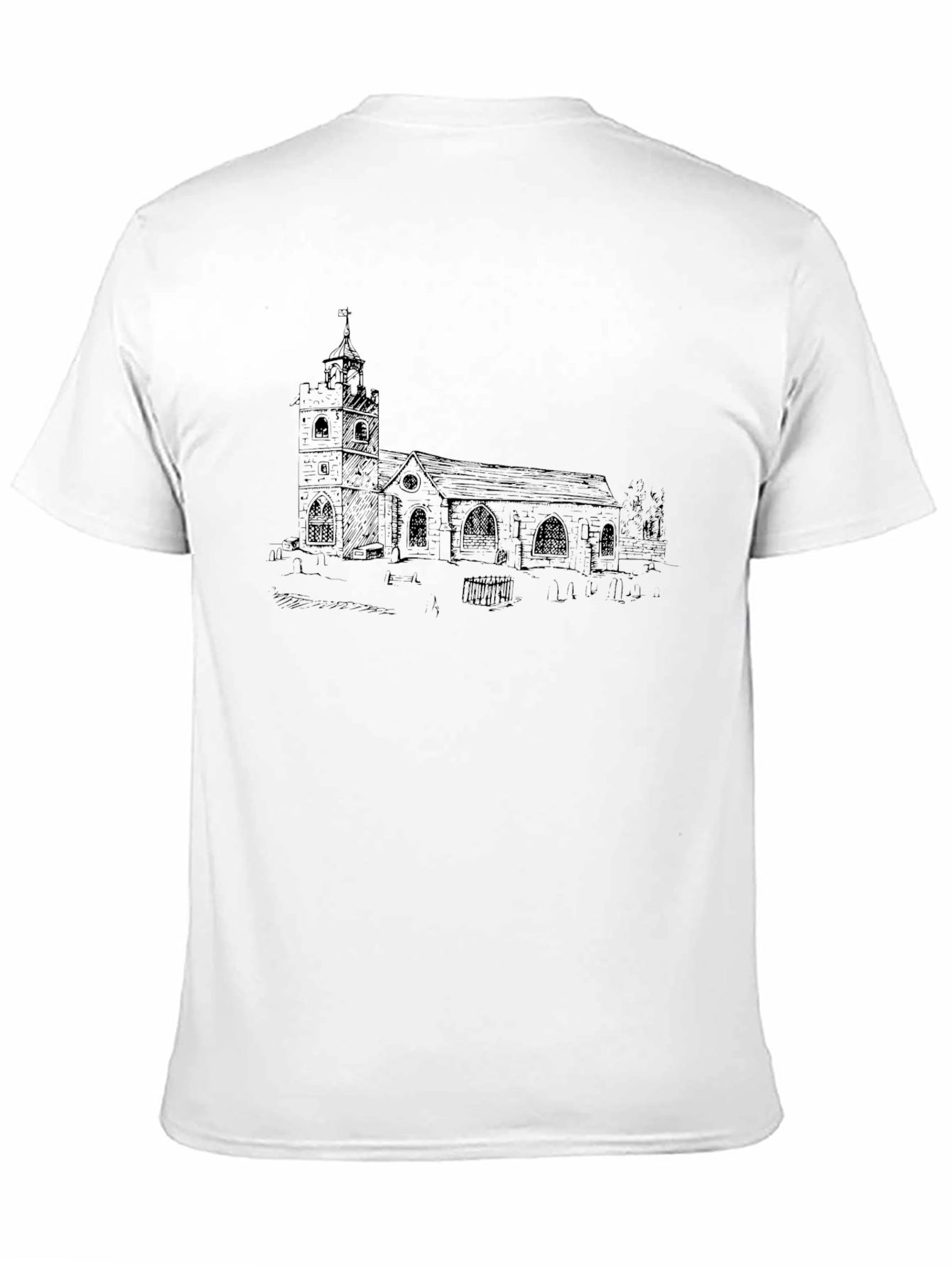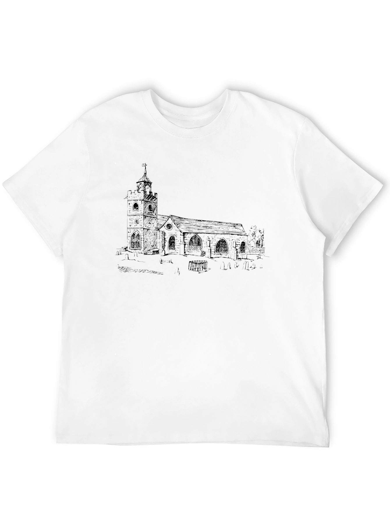 Showcase your unique style with this classic black t-shirt featuring a detailed sketch of a historic church. This short-sleeved tee offers a comfortable fit and a touch of vintage charm. The intricate church design is subtly displayed, making it a versatile piece for everyday wear. Made from soft, breathable fabric, it's perfect for casual outings, layering, or simply relaxing at home. Add a touch of artistic flair to your wardrobe with this eye-catching tee. Ideal for history buffs and lovers of architectural art.