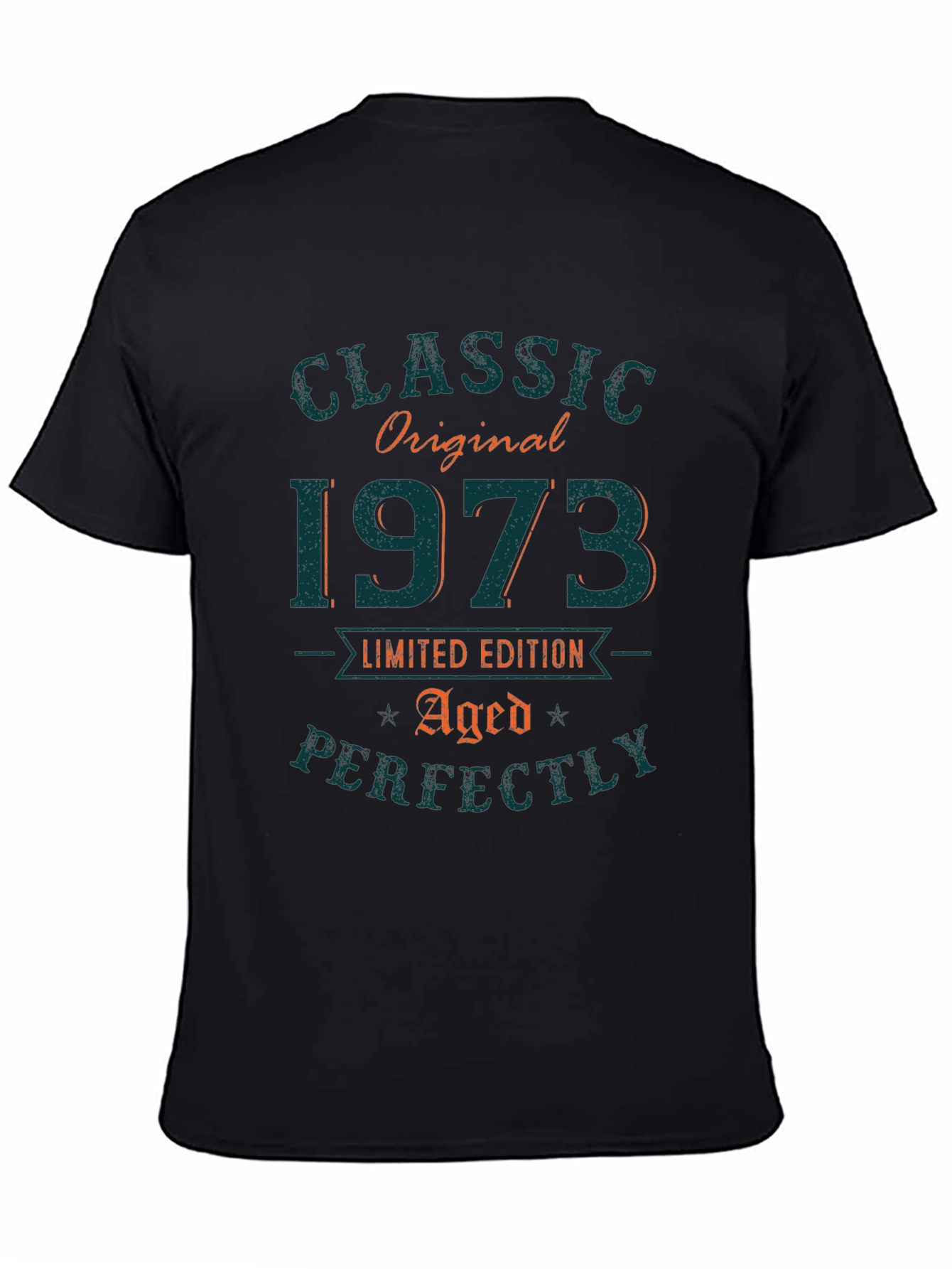 Celebrate a milestone year with this unique 'Classic Original 1973 Limited Edition Aged Perfectly' t-shirt. This black tee features a vintage-inspired design with distressed lettering in teal and orange hues. It's made from a soft, breathable fabric. Perfect for birthdays, anniversaries, or just showcasing timeless style, this shirt offers a comfortable fit and a touch of nostalgia. Wear it casually with jeans, shorts, or dress it up with a jacket. It's a must-have for anyone born in 1973 or those who appreciate a classic, aged-to-perfection aesthetic. Get yours today and add a dash of vintage charm to your wardrobe.