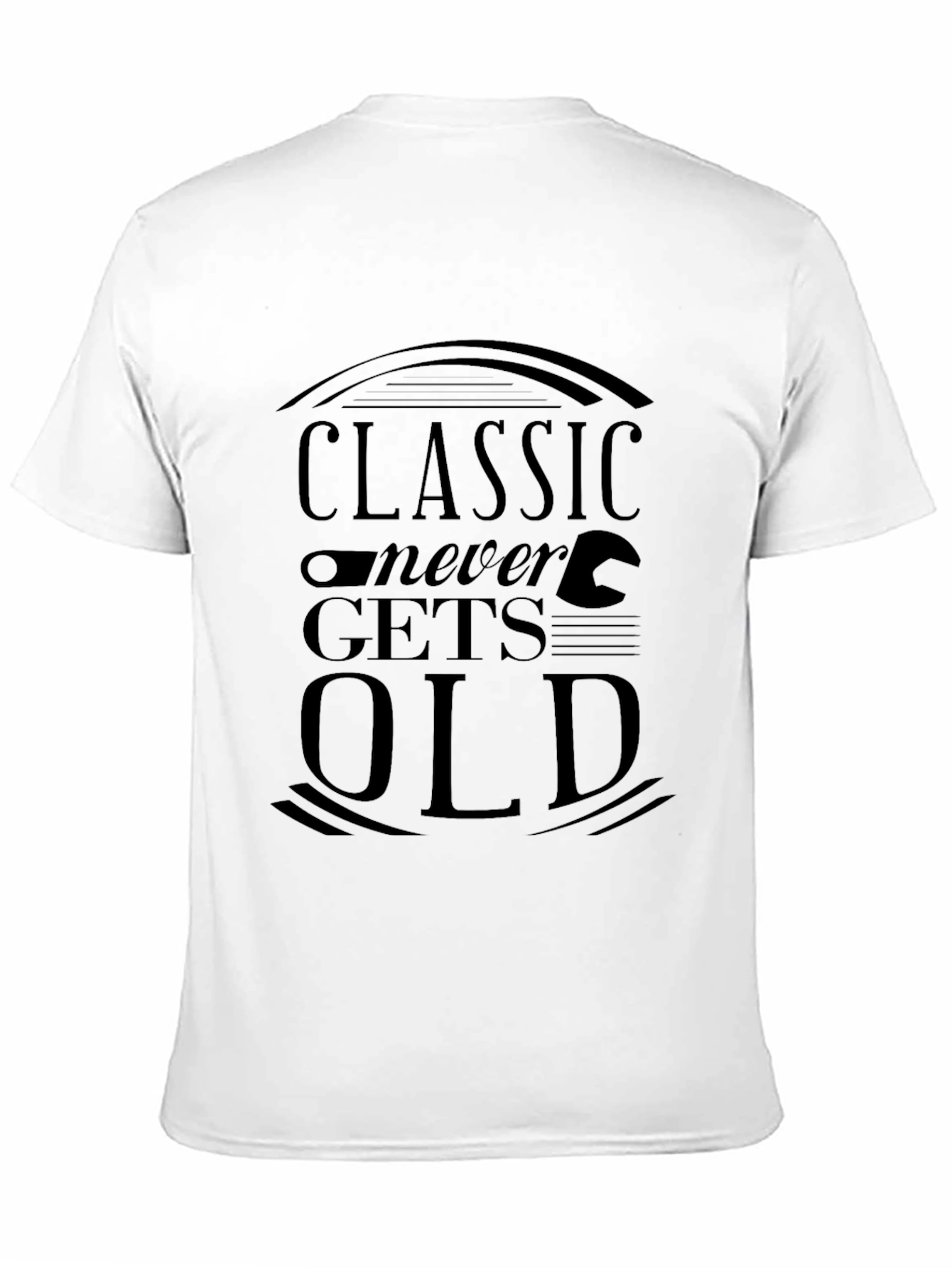 Showcase your love for timeless style with this black graphic tee. The shirt features the phrase "Classic Never Gets Old" printed in a stylish, bold font. Perfect for casual wear, this tee is made from a comfortable-looking fabric that drapes well. Pair it with jeans or shorts for a relaxed, cool look. This versatile tee is an excellent addition to any wardrobe, offering a statement of enduring appeal. Ideal for everyday wear or as a gift for someone who appreciates classic designs.