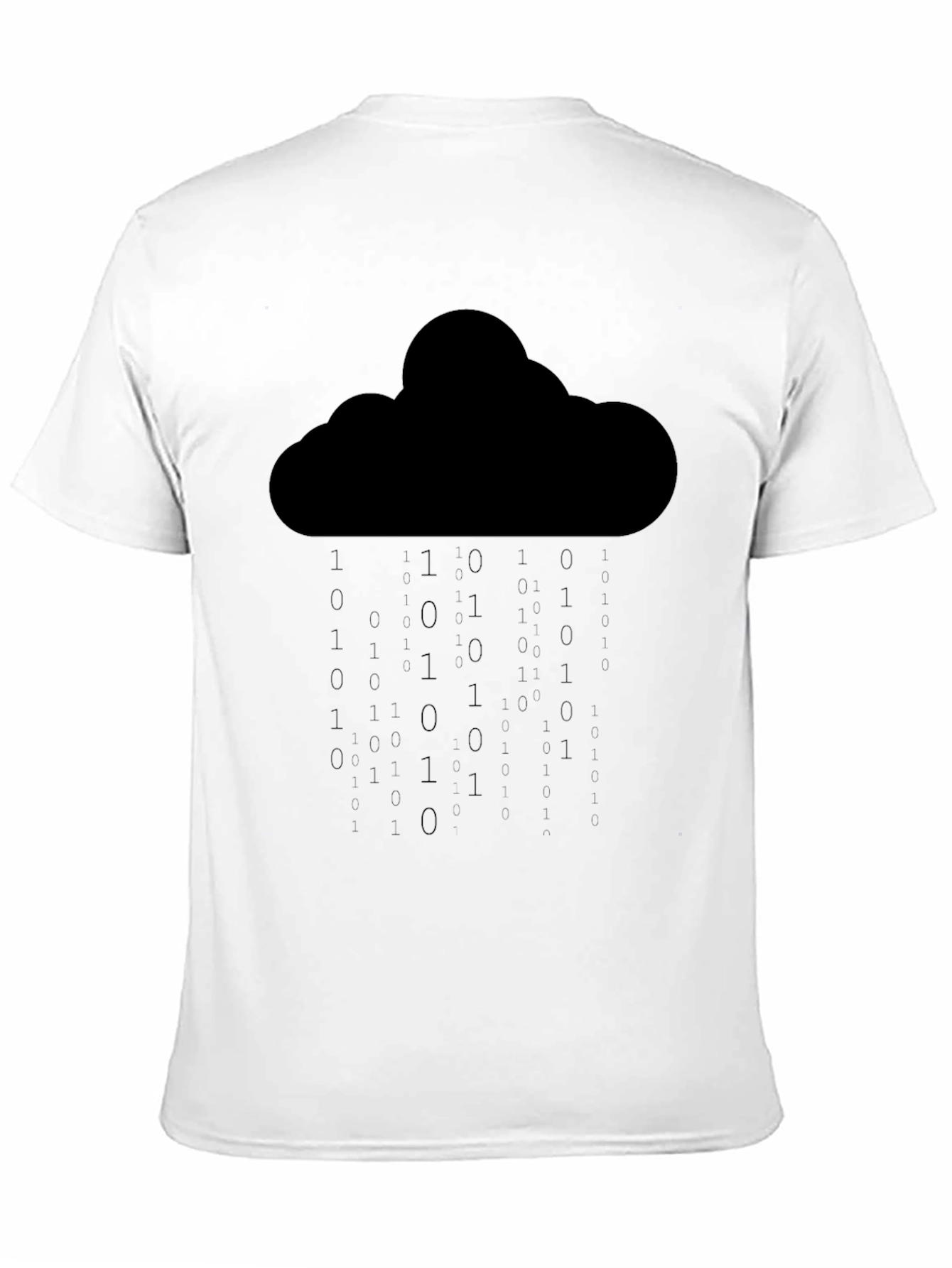 Embrace your inner tech enthusiast with this unique black t-shirt. The design features a bold, stylized cloud raining down a cascade of binary code '1's and '0's. The shirt is made from what appears to be soft, comfortable fabric, perfect for everyday wear. It's a fun, subtle way to show off your interests in technology, programming, or cloud computing. Ideal for casual outings, coding meetups, or simply relaxing at home. Stand out from the crowd with this clever and eye-catching tee! Perfect gift for coders.