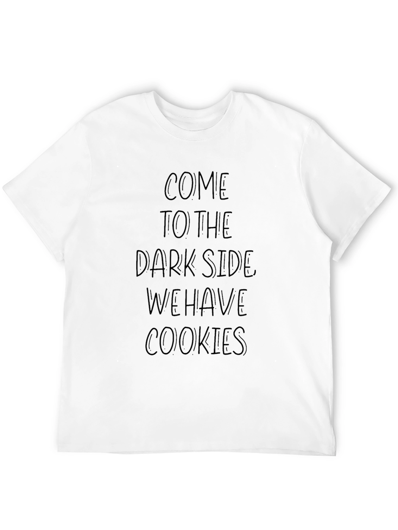 Embrace your inner cookie monster with this playful black t-shirt. Featuring the humorous slogan 'Come to the Dark Side We Have Cookies' in a simple font. It is a fun conversation starter and a must-have for anyone who loves a good laugh. The shirt appears to be crafted from a soft, breathable cotton blend. The classic crew-neck design makes it incredibly versatile for casual wear. Perfect for everyday activities, lounging at home, or as a quirky gift for friends and family. Get yours today and flaunt your sweet tooth!