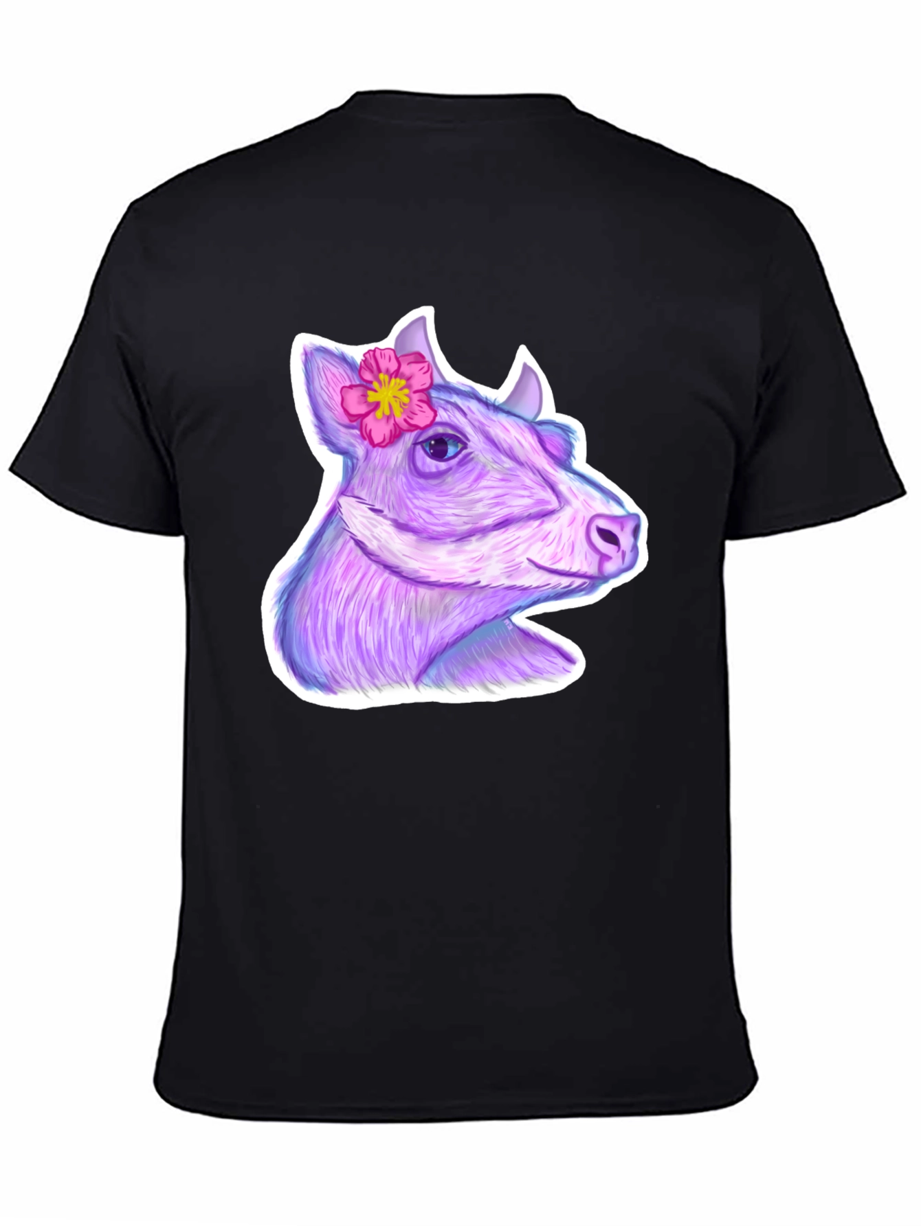 This eye-catching black t-shirt features a unique graphic design of a cow's head adorned with a vibrant pink and yellow flower. The detailed illustration has a whimsical and artistic feel, making it a standout piece in any wardrobe. Made from a soft, comfortable fabric, this tee is perfect for casual wear, adding a touch of personality to your everyday look. Show off your fun and quirky style with this must-have tee – ideal for animal lovers and art enthusiasts alike! Its relaxed fit ensures all-day comfort.
