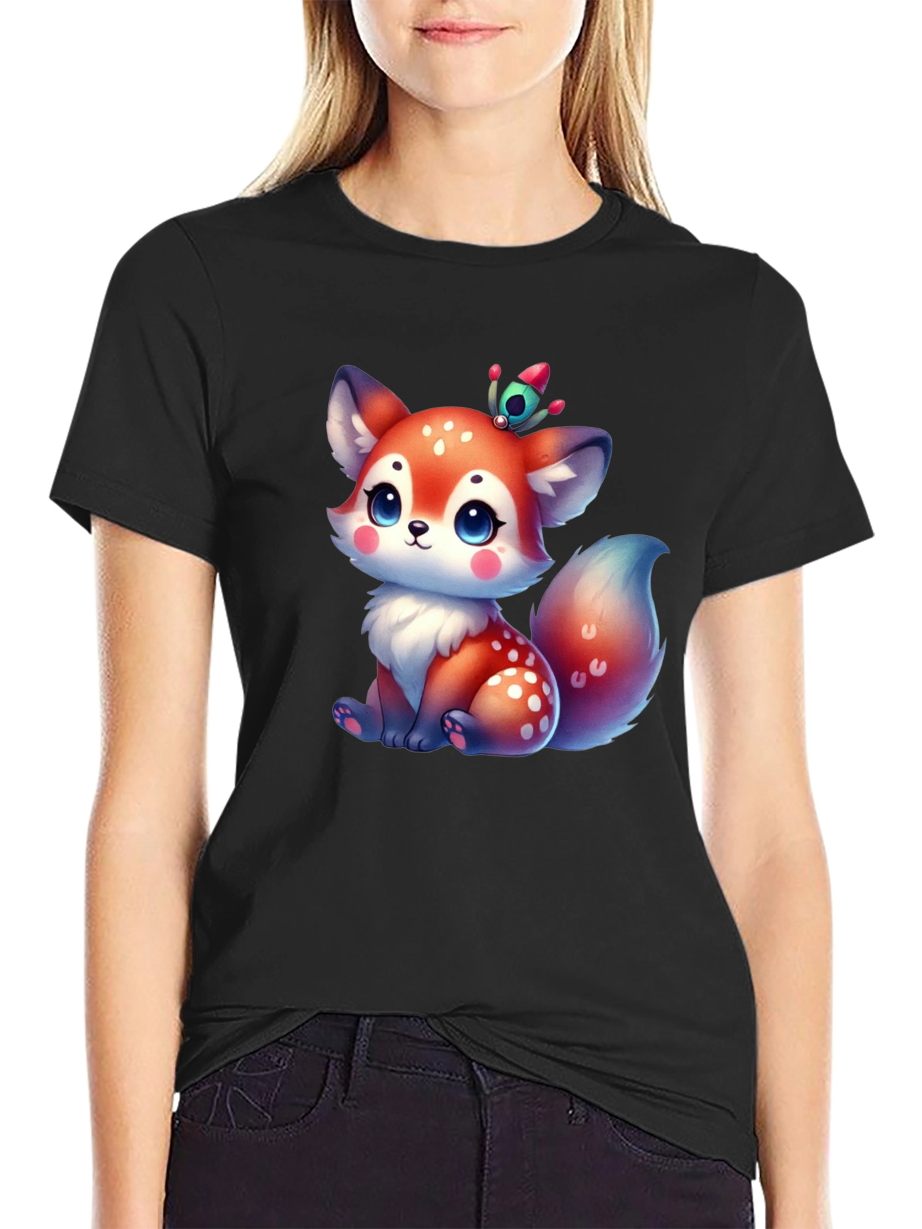 This black t-shirt features an adorable fox graphic. The fox is a cartoon style, with big blue eyes, a white chest and belly, and orange fur with white spots. It has a whimsical, playful look. The tee is made of comfortable fabric, perfect for casual wear. The unique and eye-catching graphic makes it a great conversation starter. Ideal for animal lovers or anyone who enjoys fun and quirky fashion. Wear it to school, the park, or a casual hangout with friends to showcase your playful style.