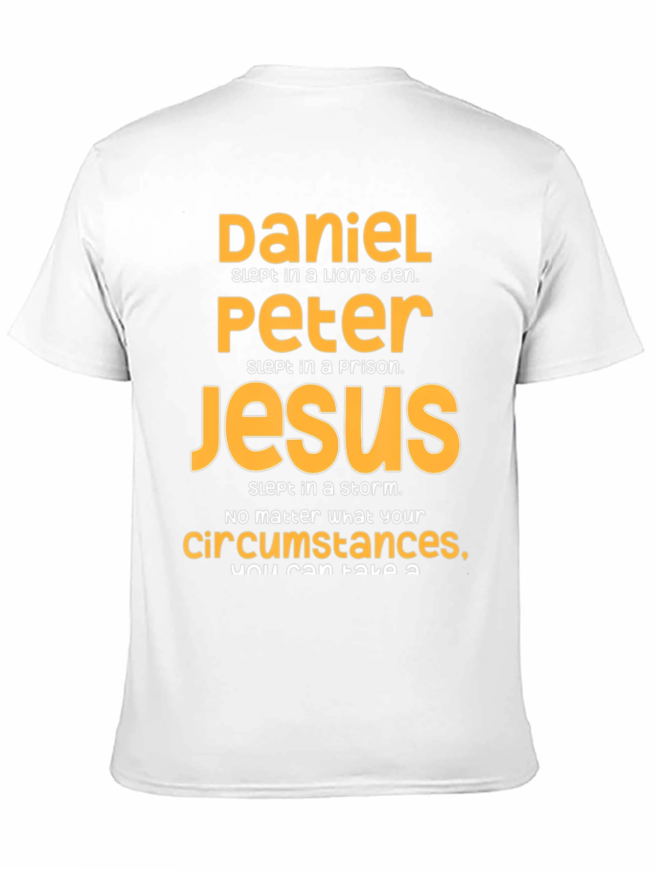 This black t-shirt features a bold, faith-inspired message. The design highlights the stories of Daniel, Peter, and Jesus, with the text "Daniel slept in a Lion's den," "Peter slept in a prison," and "Jesus slept in a storm". Beneath these lines, the shirt adds, "No matter what your circumstances, you can take a." This message of encouragement makes it ideal for everyday wear, church events, or as a thoughtful gift. The classic crew neck and comfortable fit make this t-shirt a versatile addition to any wardrobe. Show your faith with this unique shirt. The design is printed in a bright orange color. Perfect for expressing your beliefs with style.