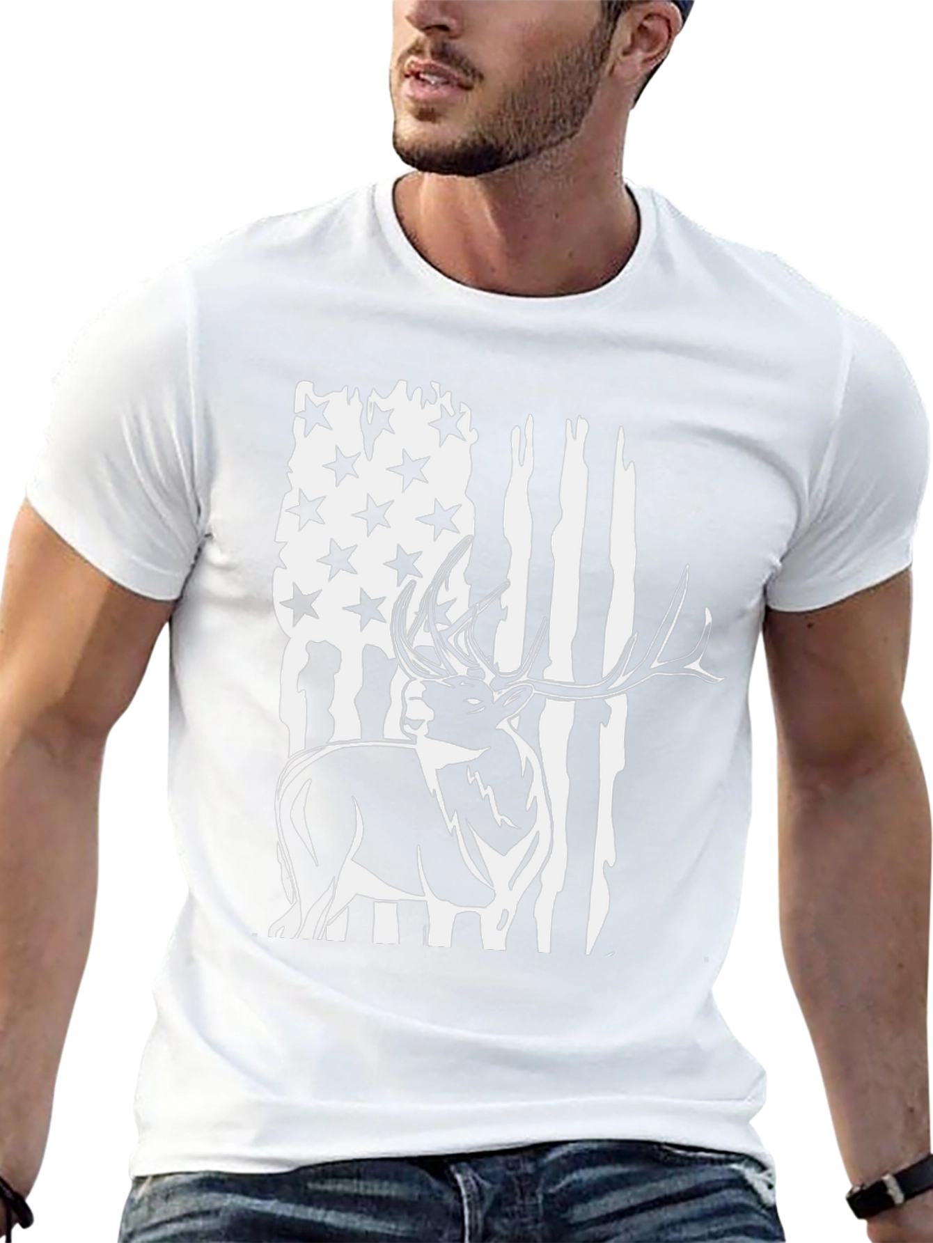Show your love for the outdoors with this unique men's black t-shirt. This eye-catching graphic tee features a bold design of a deer silhouette overlaying an American flag. The distressed flag design adds a rugged, vintage touch. Made from a soft, comfortable fabric blend, this tee is perfect for casual wear, hunting trips, or showing off your patriotic spirit. The classic crew neck and short sleeves provide a relaxed fit, making it ideal for everyday wear. Whether you're a nature enthusiast or just appreciate distinctive apparel, this tee is sure to turn heads and spark conversation. A must-have addition to any wardrobe.