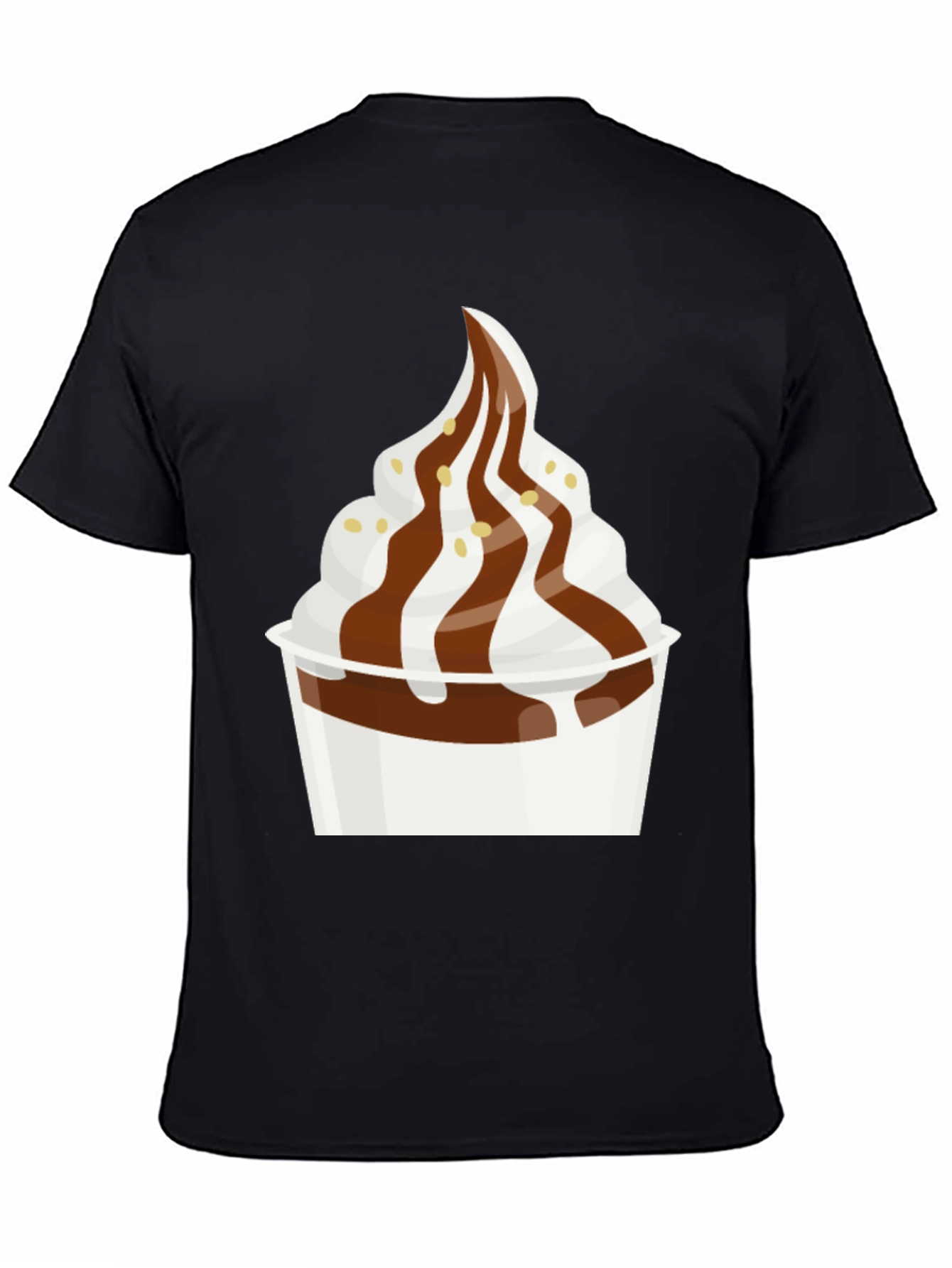 Indulge your sweet tooth with this fun and stylish black t-shirt featuring a delicious soft serve dessert graphic! The design showcases a creamy swirl of white soft serve in a cup, drizzled with rich chocolate sauce and a sprinkle of tasty toppings. This tee is perfect for ice cream lovers, foodies, or anyone who wants to add a touch of playful personality to their wardrobe. Made from a comfortable and durable fabric, this t-shirt is ideal for everyday wear. Dress it up with a jacket and jeans or keep it casual with shorts. Let this unique and eye-catching t-shirt express your love for all things sweet!