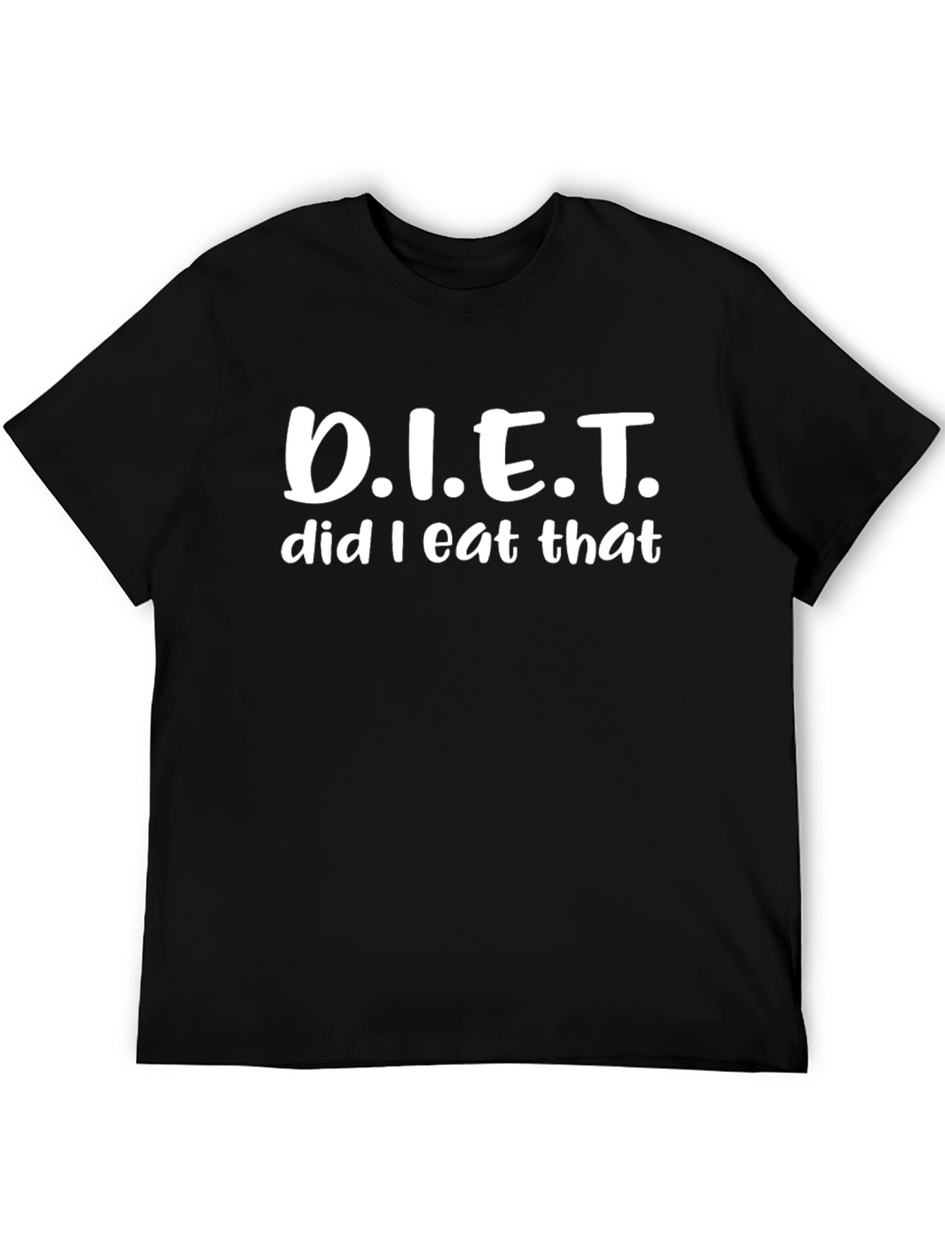 This black t-shirt features the humorous phrase "D.I.E.T. did I eat that" in bold, white lettering. The shirt is made from a soft-looking fabric, likely cotton or a cotton blend, and has a classic crew neck and short sleeves for a comfortable, casual fit. It's perfect for anyone with a sense of humor about dieting or anyone who loves witty apparel. Wear it to the gym, while running errands, or just lounging around the house. It's sure to get a laugh and make a statement.