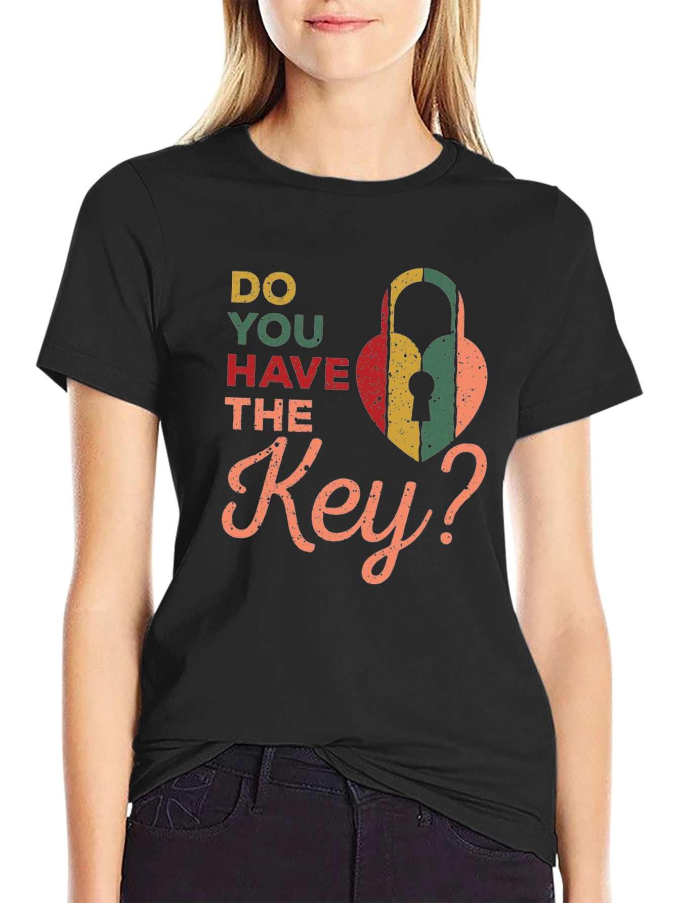 Show off your playful side with this stylish black graphic tee. Featuring a vibrant and retro-inspired design that asks "Do You Have The Key?" alongside a heart-shaped padlock, this shirt is sure to spark conversation. The design incorporates a vintage color palette, adding a touch of nostalgia. Made from a comfortable fabric, this tee is perfect for casual outings, social events, or everyday wear. Express your unique sense of humor and make a statement with this eye-catching and comfortable shirt!