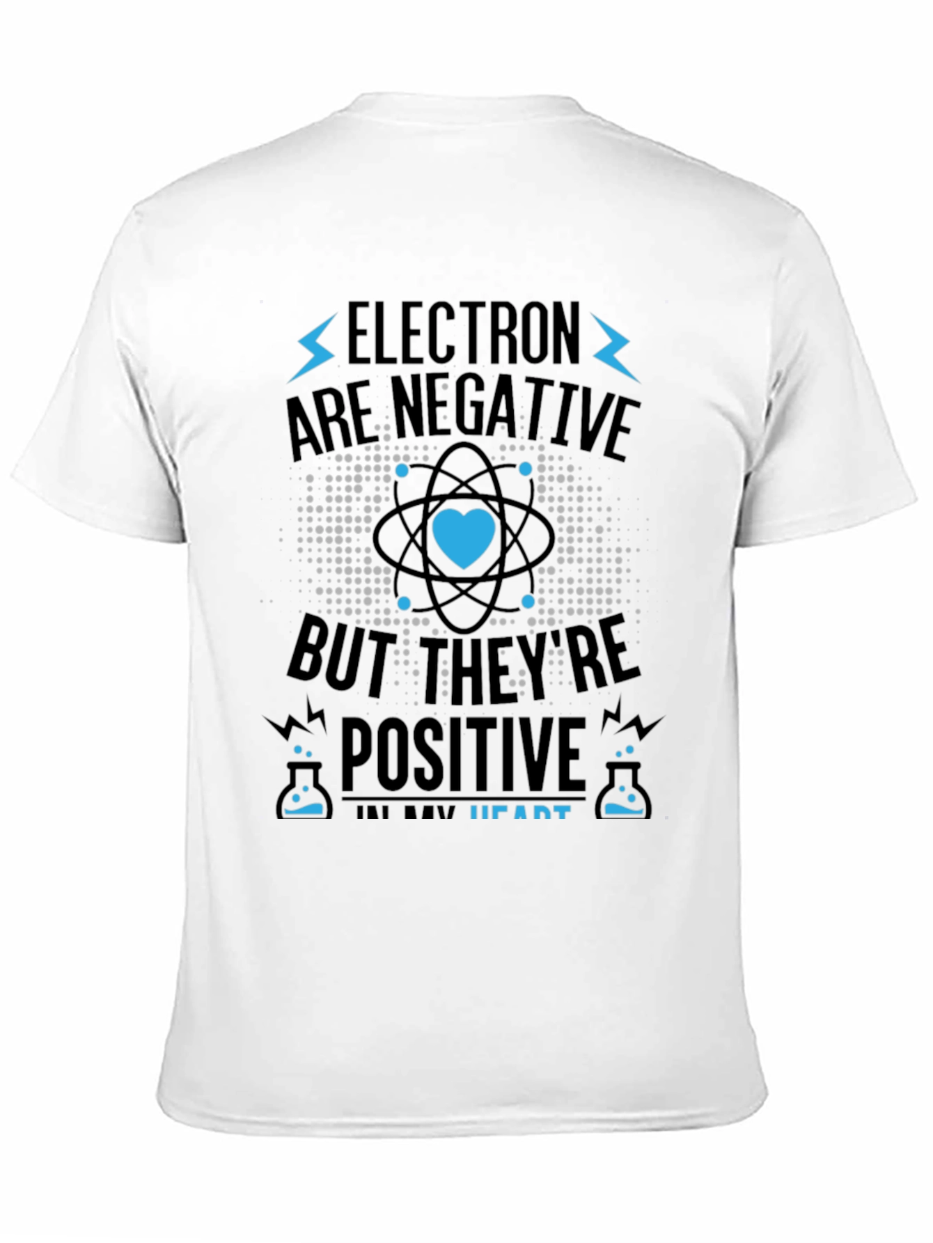 Show your love for science with this unique and stylish black t-shirt. The shirt features a playful design with the phrase "Electrons Are Negative But They're Positive In My Heart", accompanied by a stylized atom with a heart at its center. This tee is perfect for science enthusiasts, teachers, or anyone with a love for physics and chemistry. The design is printed in a cool, eye-catching blue color that pops against the black background. Made from soft, comfortable fabric, this t-shirt is perfect for everyday wear. Let your passion for science shine with this fun and educational t-shirt.