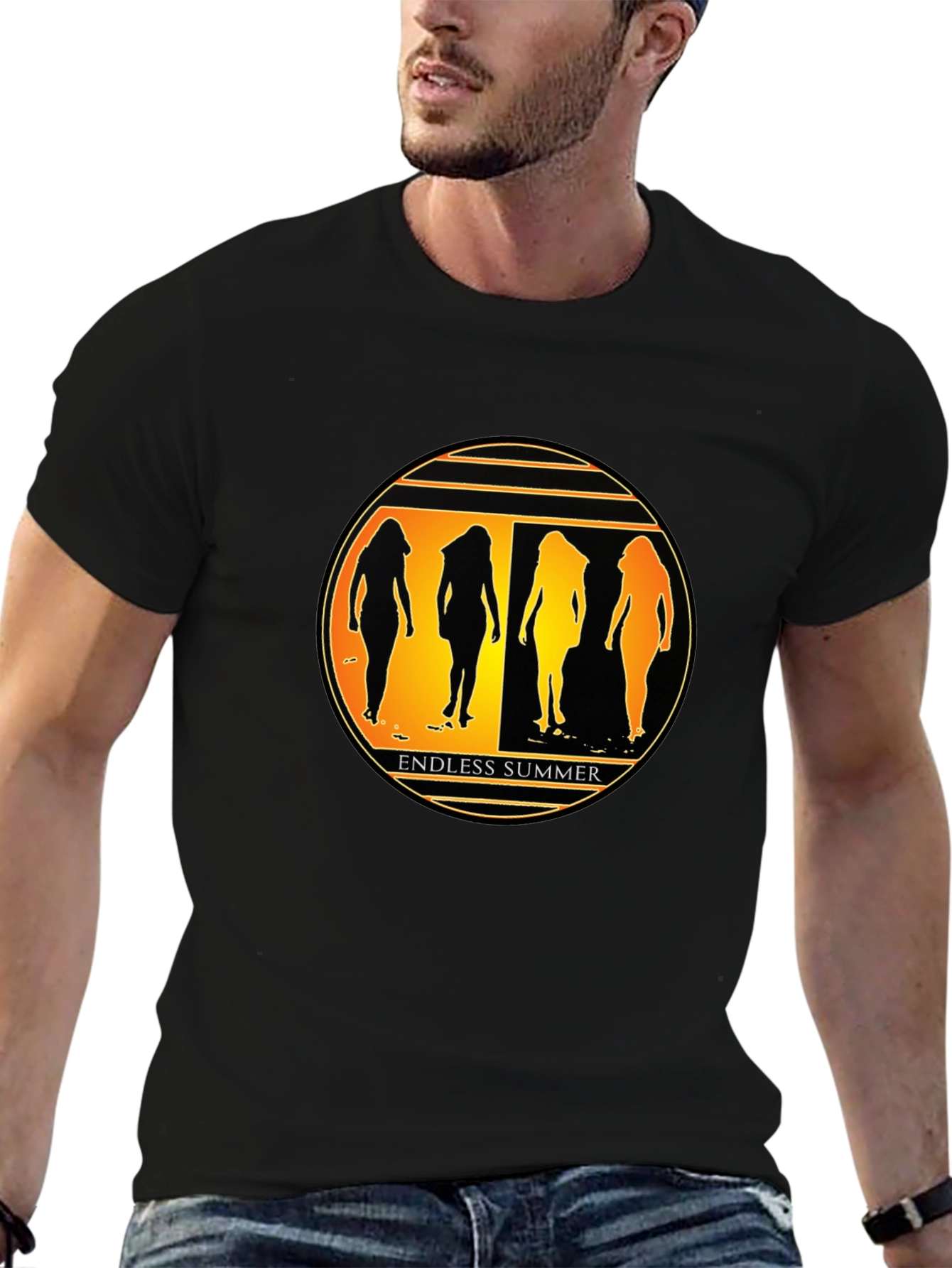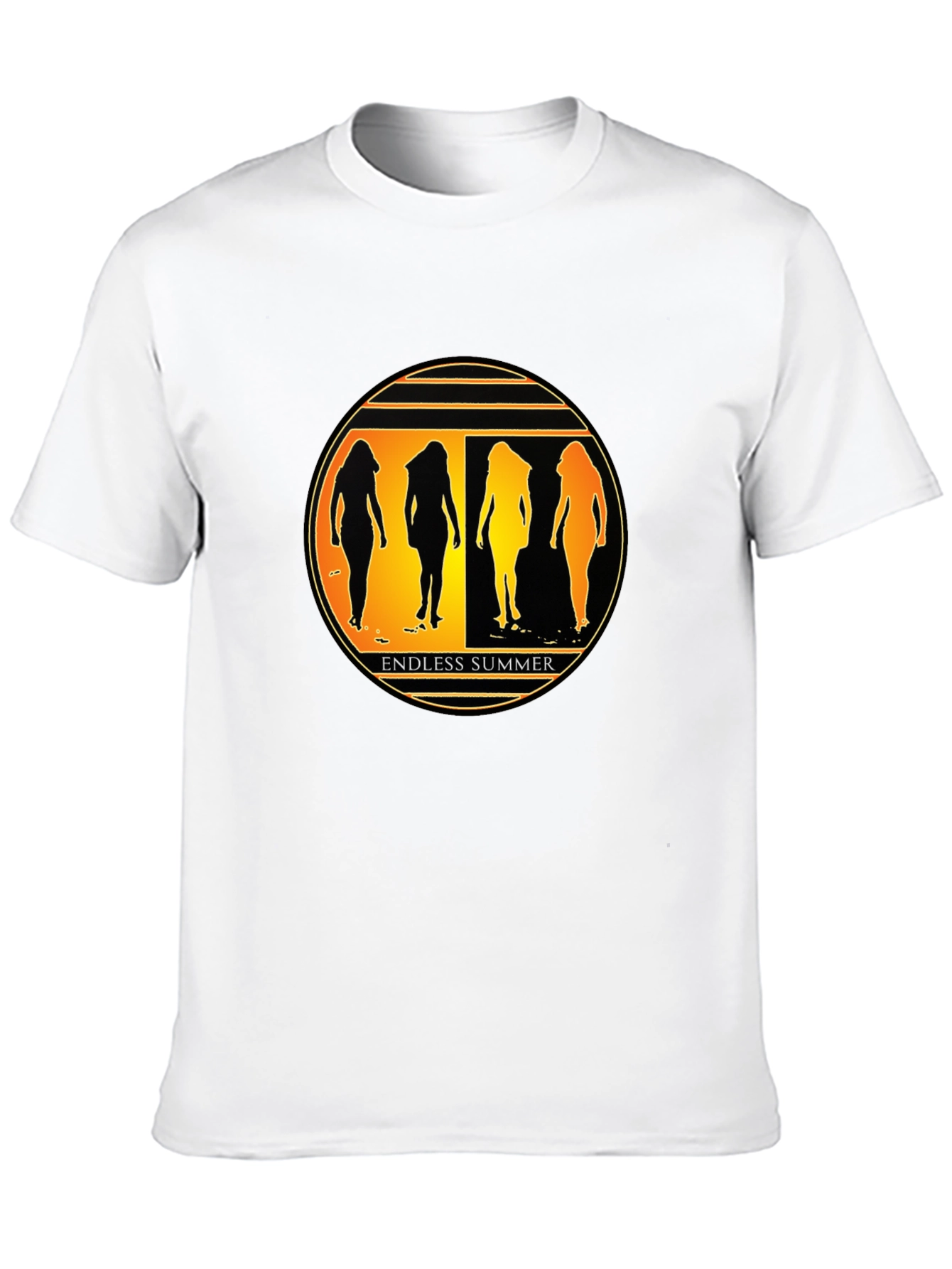 Embrace the spirit of endless summer with this eye-catching graphic tee. The black t-shirt features a vibrant, circular design with silhouettes of women against a golden sunset backdrop. The text 'ENDLESS SUMMER' is displayed below the graphic. Made from comfortable fabric, this tee offers a relaxed fit, perfect for everyday wear. Whether you're heading to the beach, hanging out with friends, or just looking to add a touch of summer to your wardrobe, this t-shirt is a perfect choice. The unique design and soft fabric will keep you comfortable and stylish all day long. A must-have for any summer lover!