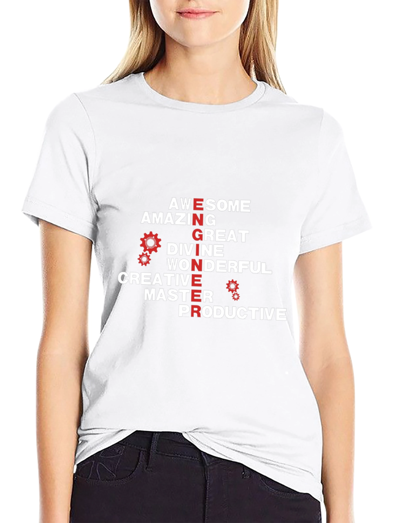 Show off your engineering pride with this unique black t-shirt. Featuring a creative design that spells out "ENGINEER" using words like "Awesome," "Amazing," "Great," "Divine," "Wonderful," "Creative," "Master," and "Productive." Red accents highlight the letters and include gear graphics, adding a touch of mechanical flair. Made from comfortable fabric, this tee is perfect for casual wear, engineering events, or as a thoughtful gift for the engineer in your life. Get yours today and wear your profession with pride!