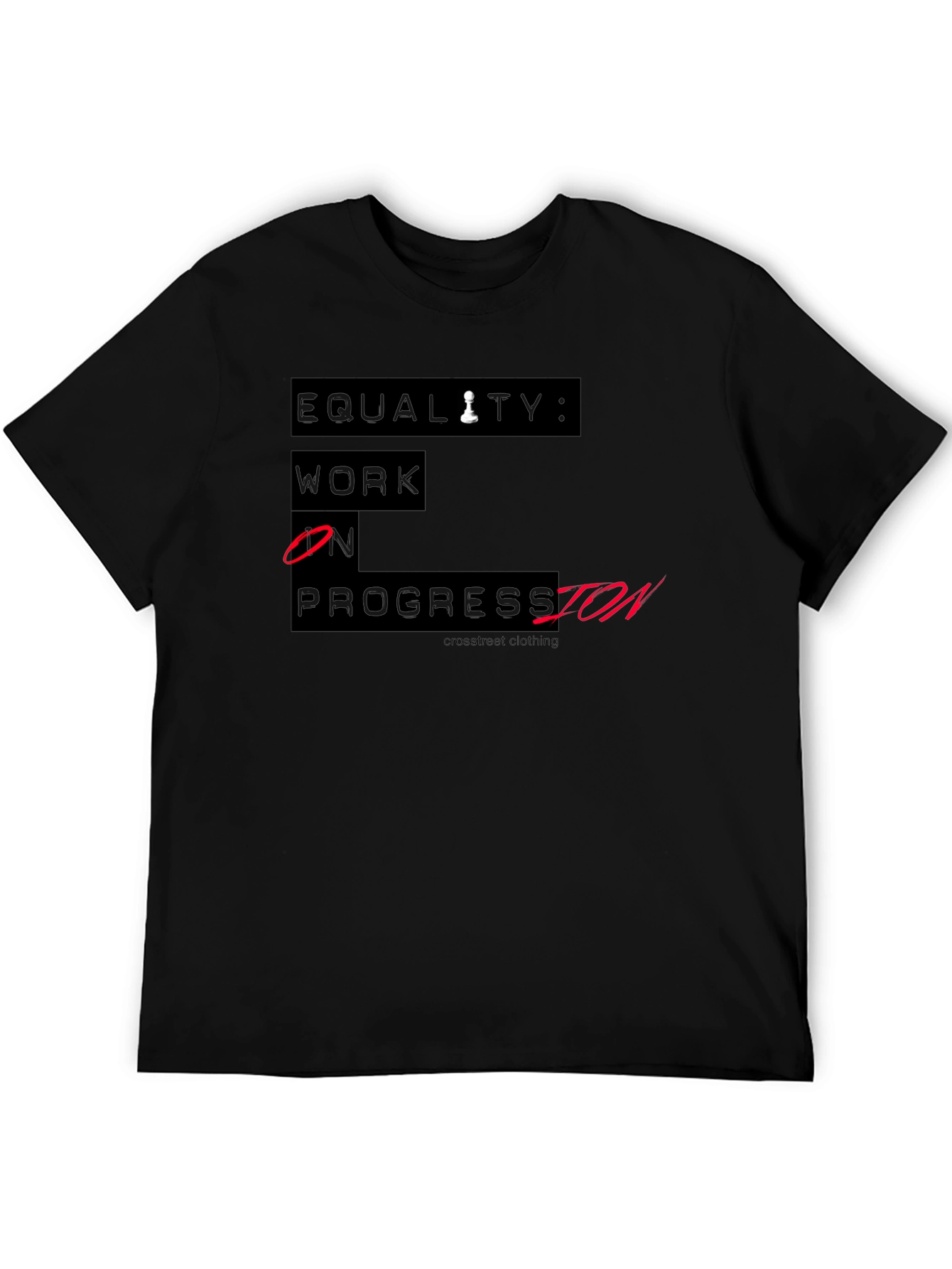 This black t-shirt features a unique graphic design centered around the theme of equality and progress. The design incorporates text elements like "EQUALITY," "WORK," and "PROGRESSION," with certain letters highlighted in red to create a bold and eye-catching effect. A chess piece is used instead of letter 'i' which adds a creative touch to the overall composition. Made from a soft-looking fabric, this tee is suitable for casual wear. The design suggests a message of ongoing effort toward equality, making it a great choice for anyone who wants to express their views in a fashionable way. Perfect for everyday wear.