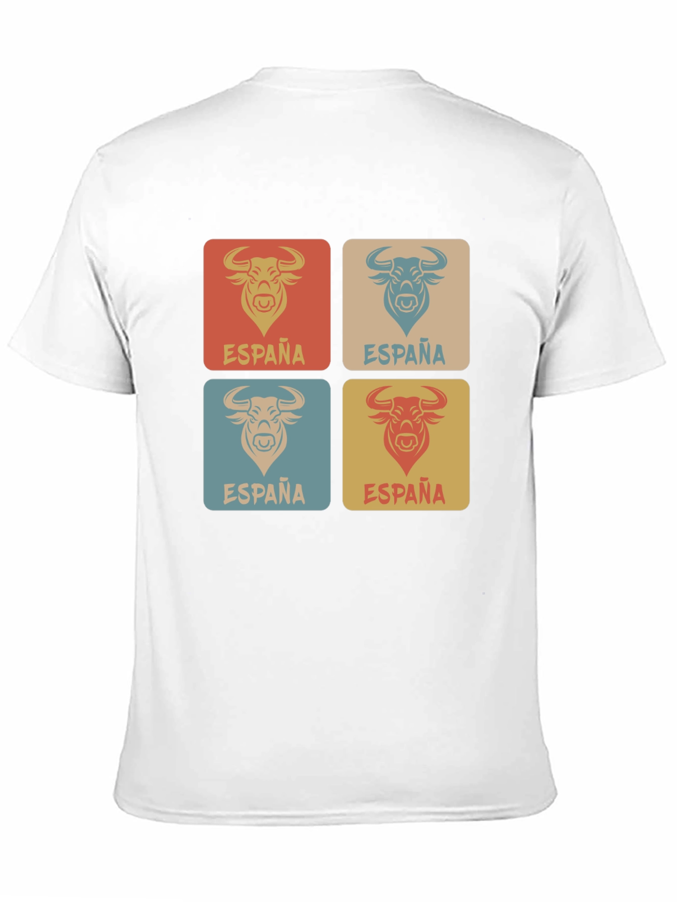 Show your Spanish pride with this vintage-inspired España graphic tee. The shirt features a retro design with four squares, each containing a stylized bull and the word "España". The design uses a warm color palette that evokes a classic feel. Made from a soft, breathable fabric, this t-shirt ensures comfort and style. Perfect for casual wear, travel, or as a unique souvenir. A great gift for anyone who loves Spain or appreciates vintage design. Add a touch of Iberian flair to your wardrobe!