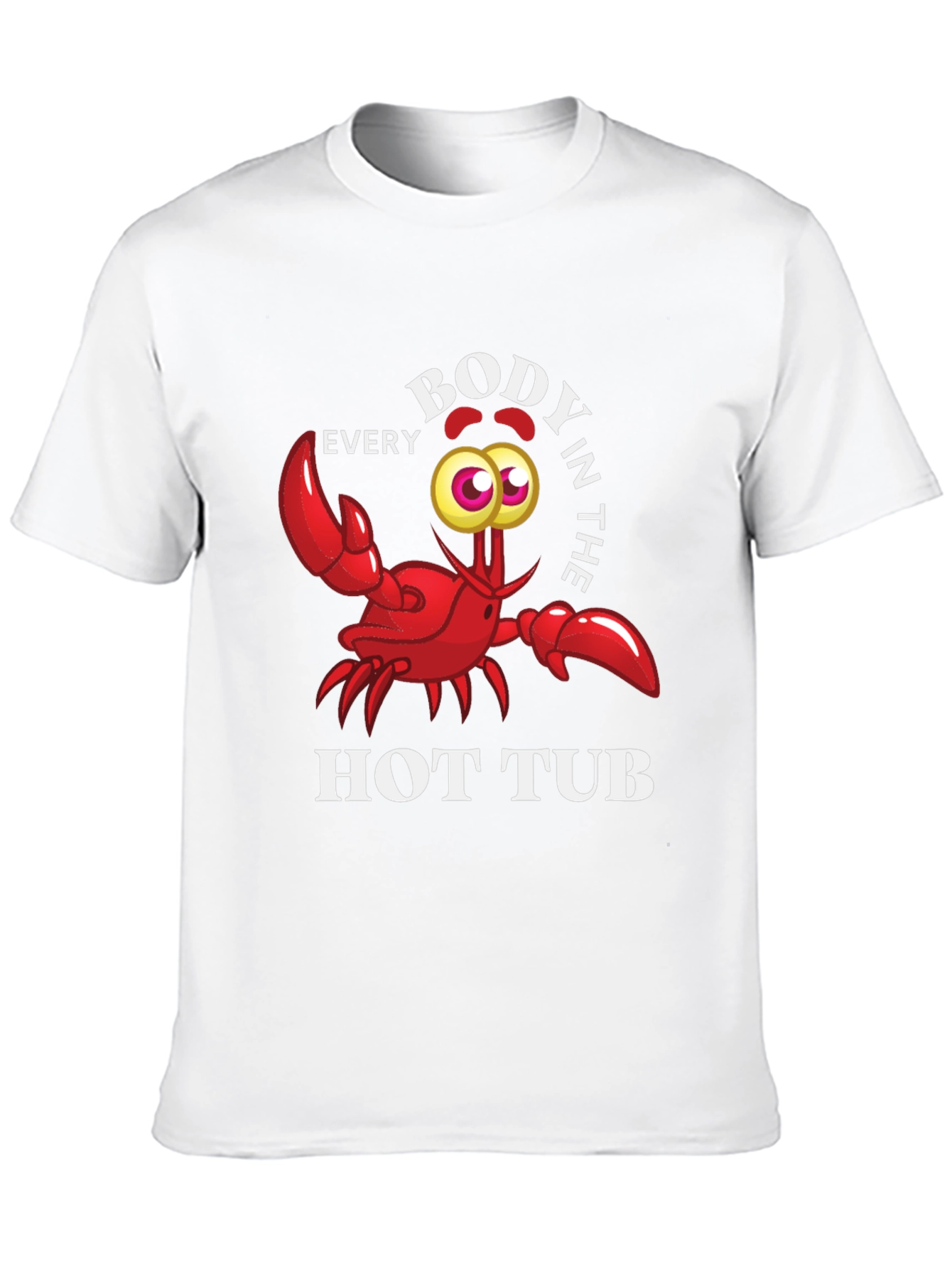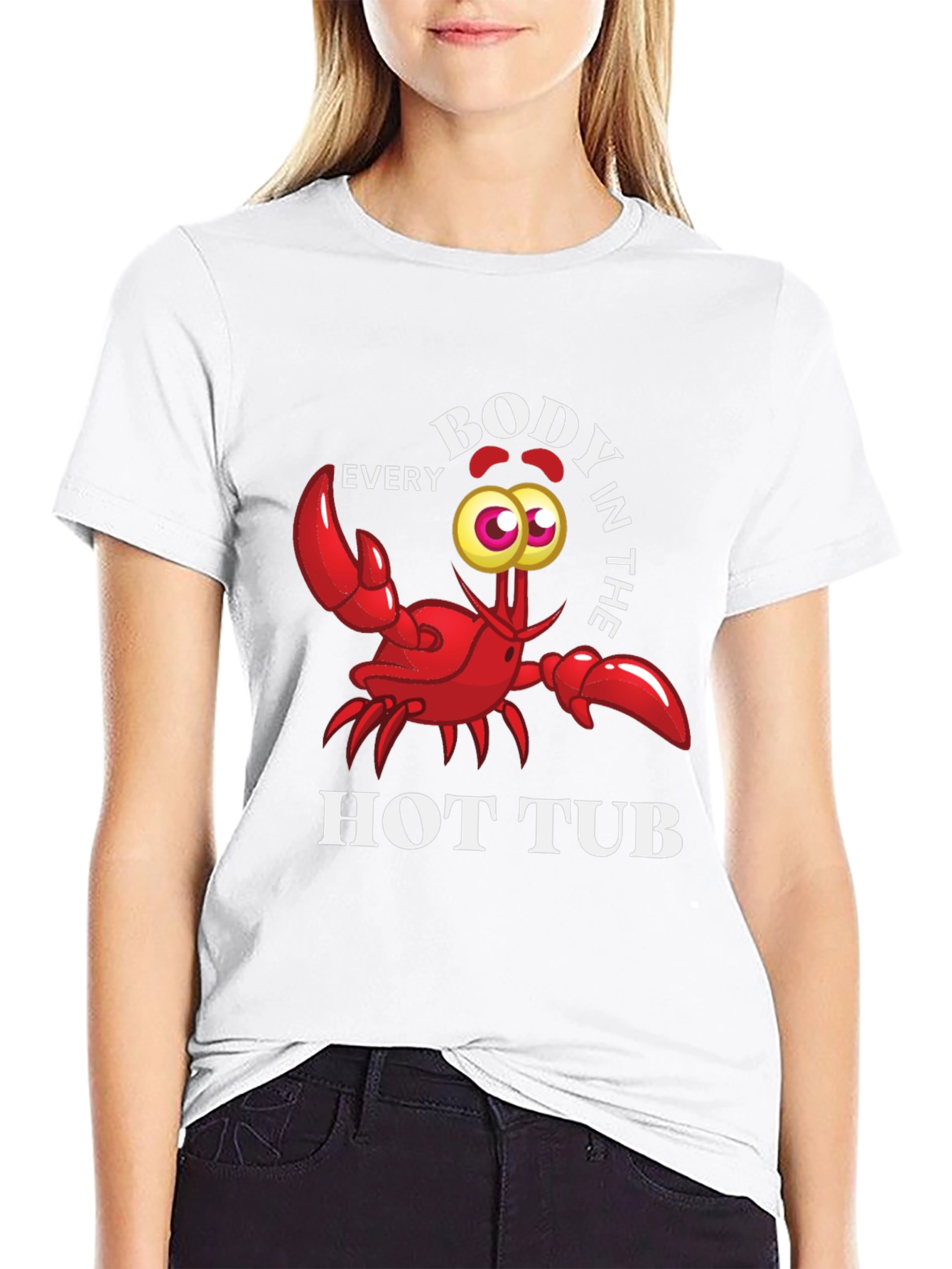 Get ready to make a splash with this eye-catching black t-shirt! Featuring a vibrant, cartoon-style red crab design, this tee is sure to turn heads. The playful graphic includes the phrase "Every Body in the Hot Tub" in bold, white lettering, adding a touch of humor to your wardrobe. Made from a comfortable-looking fabric, this shirt is perfect for casual outings, beach days, or lounging by the pool. Show off your fun-loving personality with this unique and stylish t-shirt. It's a must-have for anyone who enjoys a good laugh and a relaxing time!
