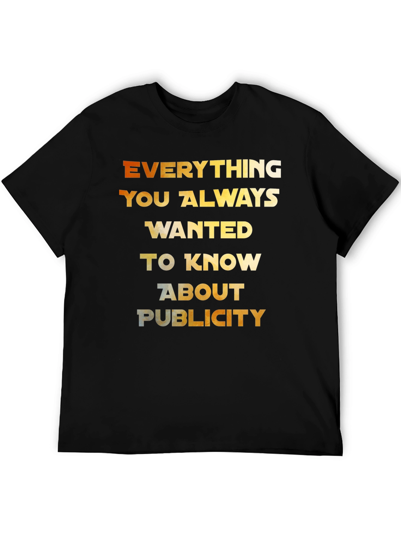 Express yourself with this eye-catching black t-shirt! Featuring a bold, multi-toned graphic print that reads "Everything You Always Wanted To Know About Publicity," this tee makes a statement. The design boasts a gradient color scheme, transitioning from warm orange to cooler gold tones, adding visual depth. Crafted from what appears to be a soft and comfortable cotton blend, this casual tee is perfect for everyday wear. Pair it with jeans or shorts for a relaxed yet stylish look. Stand out from the crowd and let your tee do the talking!