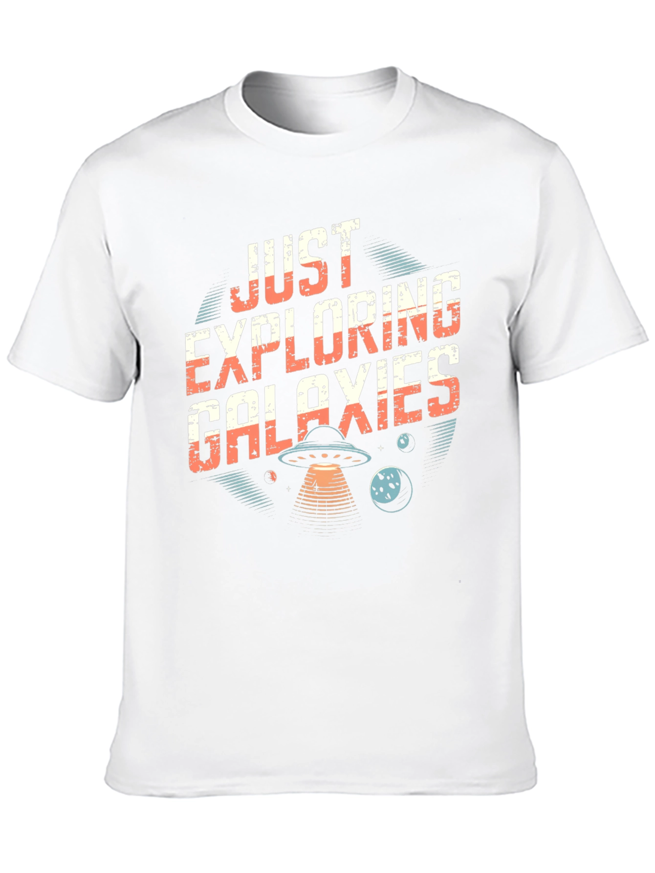 Embark on interstellar adventures with this bold black graphic t-shirt! Featuring a vibrant design of a classic UFO, planets and the statement "Just Exploring Galaxies". The retro-inspired font adds a touch of vintage charm. Crafted from what appears to be soft, breathable cotton, this tee offers all-day comfort, perfect for casual outings or cosmic-themed events. Express your love for space exploration with this unique and eye-catching tee. Makes a great gift for astronomy enthusiasts!