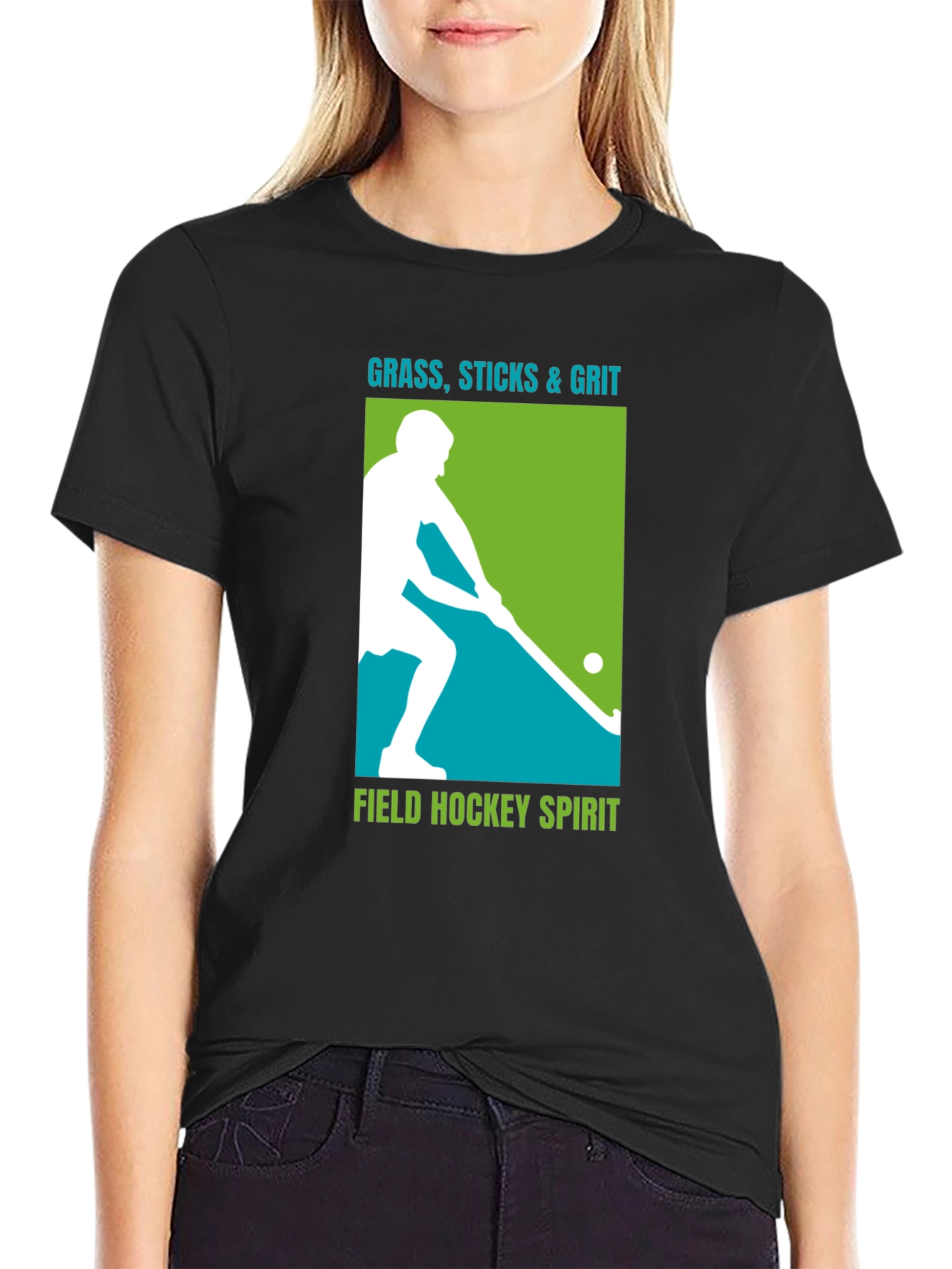Show your passion for field hockey with this stylish graphic tee. The black t-shirt features a bold, eye-catching design showcasing a field hockey player silhouette in white against a split green and blue rectangular background. "Grass, Sticks & Grit" is printed above the graphic, and "Field Hockey Spirit" is printed below. Made from a comfortable, breathable fabric, this shirt is perfect for players, fans, and anyone who loves the sport. Wear it to practice, games, or casual outings to display your field hockey enthusiasm. Get yours today and let everyone know you're a true field hockey spirit!