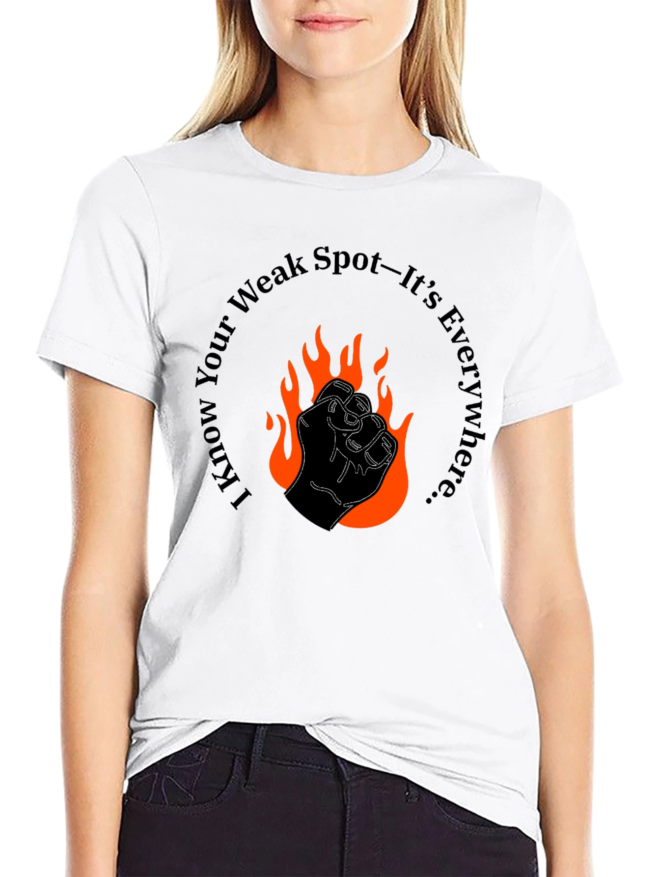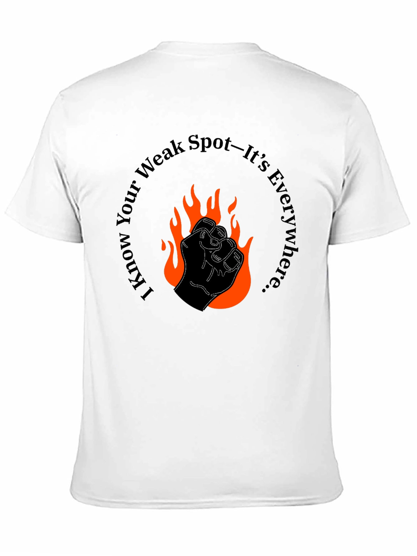 Make a bold statement with this striking black t-shirt. The design features a stylized fist engulfed in fiery orange flames, conveying power and intensity. Encircling the graphic is the phrase "I Know Your Weak Spot—It's Everywhere...", adding an edgy and confident vibe. Perfect for those who want to showcase their strength and individuality, this tee is sure to turn heads. Pair it with jeans or casual pants for a standout look. Made for comfort and style, this t-shirt is the perfect addition to any wardrobe.