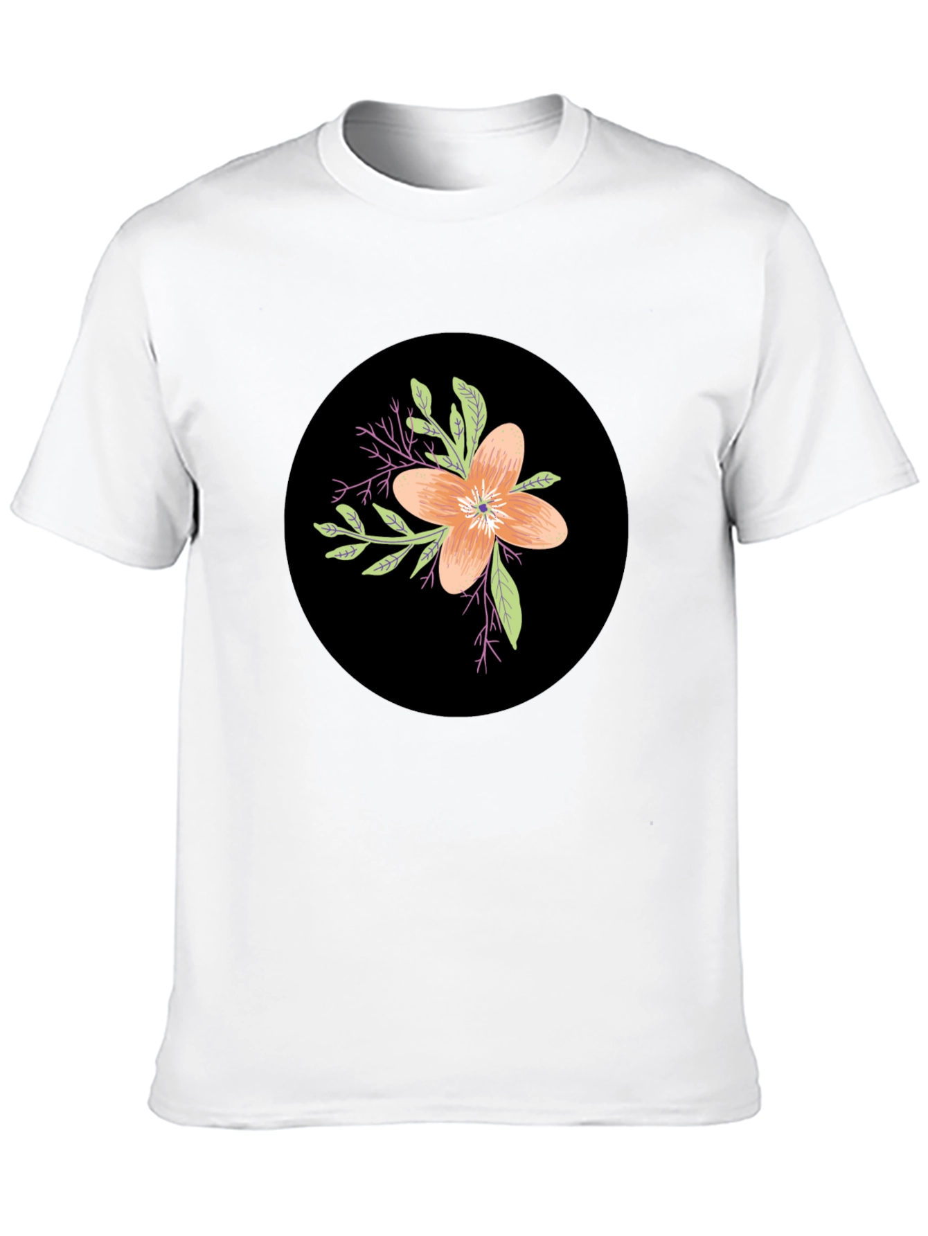 Elevate your casual wardrobe with this stylish black T-shirt. Featuring a captivating floral design encased in a bold black circle, this tee is perfect for making a statement. The design includes a peach colored flower with hints of purple and green leaves. Made from a comfortable material, it's ideal for everyday wear. Dress it up with a jacket or keep it casual with jeans. A must-have for those who appreciate unique and eye-catching apparel.