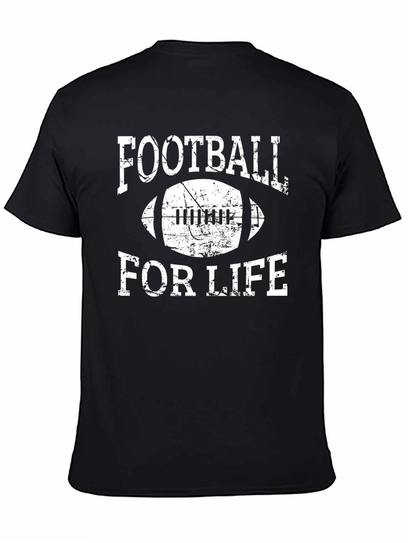 Showcase your love for the game with this stylish black graphic tee. This shirt features a bold white print that reads 'FOOTBALL FOR LIFE' with a distressed vintage effect. The design incorporates a classic football image. The black color ensures it pairs well with a variety of outfits. Wear it to the game, casual outings, or while lounging at home. It's comfortable and fashionable, perfect for any football enthusiast's wardrobe. Available in various sizes. Get yours today and live the football lifestyle!
