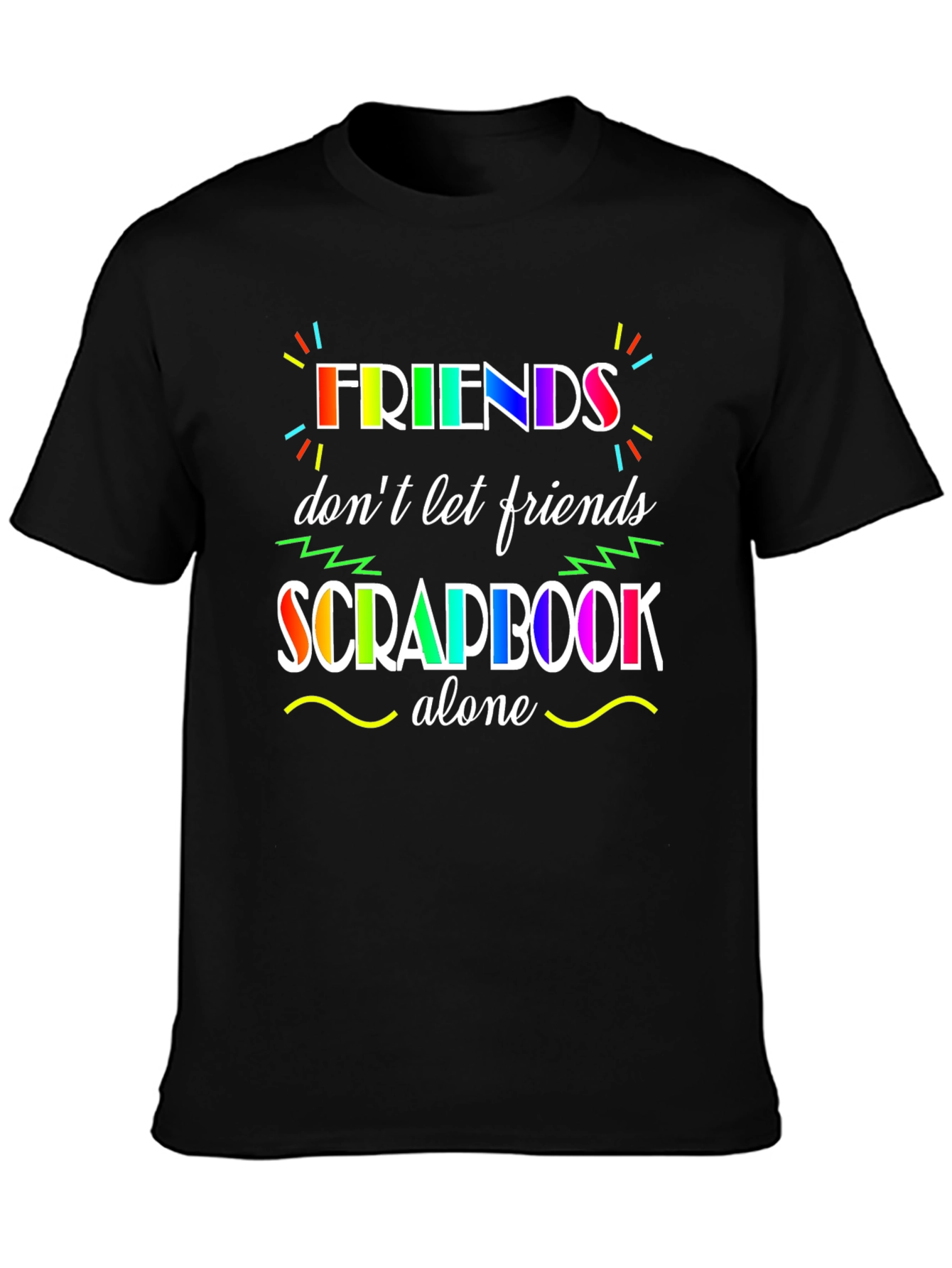 Show off your passion for scrapbooking with this fun and vibrant T-shirt! This black tee features a colorful design with the phrase "FRIENDS don't let friends SCRAPBOOK alone". The playful text is adorned with bright rainbow colors, zig-zag accents, and decorative lines, making it a cheerful and eye-catching statement piece. Perfect for wearing to scrapbooking meetups, craft nights, or just around town to express your love for this creative hobby. A great gift for the crafty friend in your life! The soft fabric ensures a comfortable fit for all-day wear.