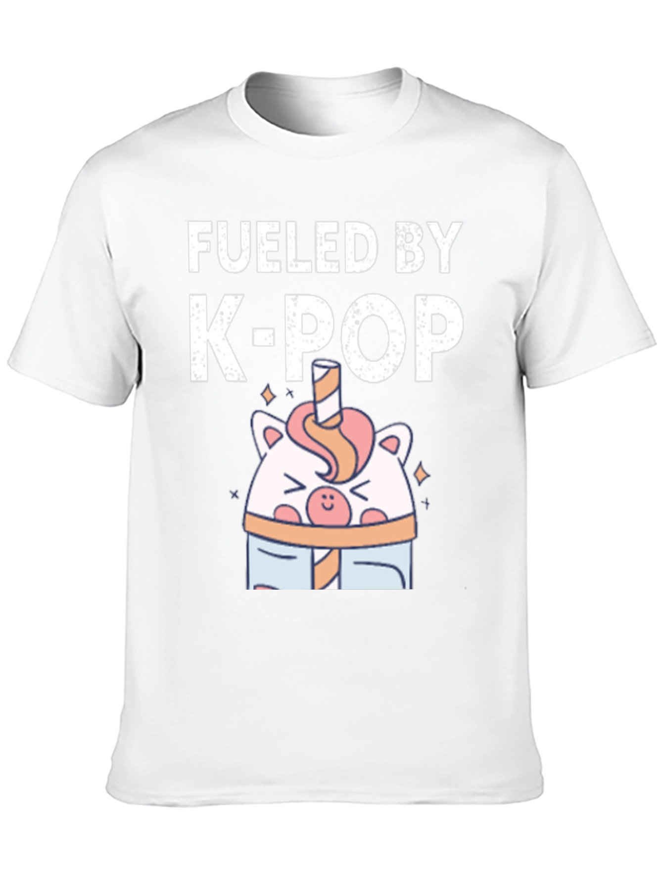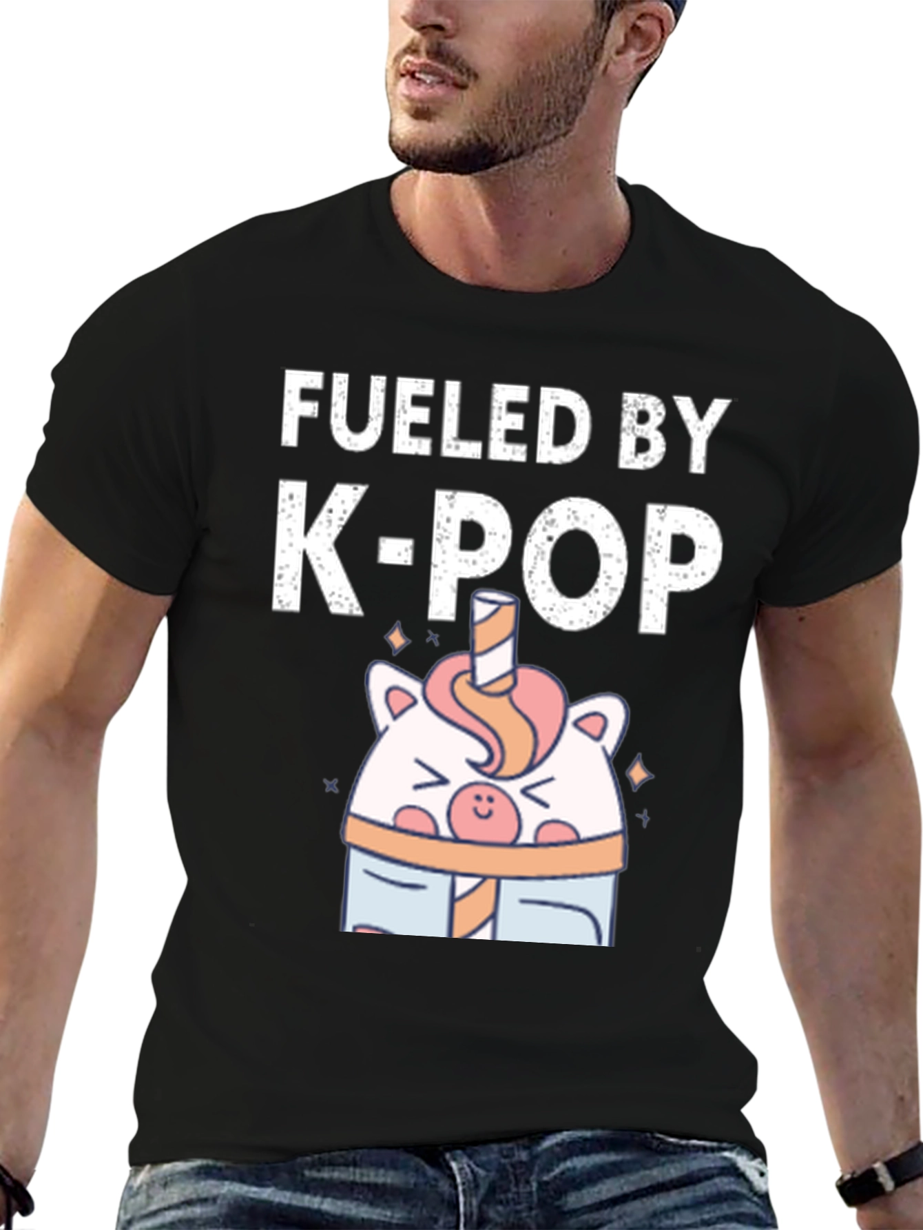 Show your love for K-Pop with this fun and stylish black T-shirt! The design features the text "Fueled By K-Pop" in bold white letters above a cute, kawaii-style illustration of a beverage with a unicorn theme. Perfect for K-Pop fans, this tee is sure to turn heads and spark conversations. Wear it to concerts, fan events, or just around town to express your passion for Korean pop music. This comfortable T-shirt is a must-have addition to any K-Pop lover's wardrobe. Get yours today and let the world know you're fueled by K-Pop!