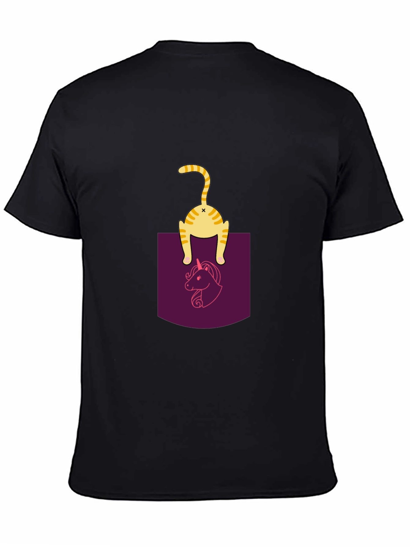 Add a touch of whimsy to your wardrobe with this unique t-shirt! This fun design features a playful cartoon cat with its tail sticking out of a faux pocket. Inside the pocket, you'll spot a whimsical unicorn illustration, adding a layer of surprise. Made from a soft, breathable fabric, this tee offers all-day comfort and is perfect for casual wear. Express your fun side and make a statement wherever you go. Great for everyday wear or as a conversation starter, this tee will add personality to your wardrobe.