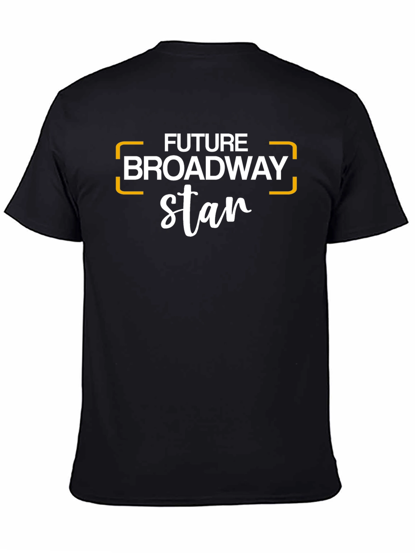 Show off your aspirations with this stylish black t-shirt! Featuring a bold 'FUTURE BROADWAY star' print, accented with a decorative gold bracket design. This tee is perfect for aspiring performers, theater enthusiasts, or anyone dreaming of the stage. Made from a comfortable material, it offers a classic fit for everyday wear. Let your passion shine and inspire others with this eye-catching and motivational t-shirt. Wear it to rehearsals, auditions, or casually to express your love for Broadway.